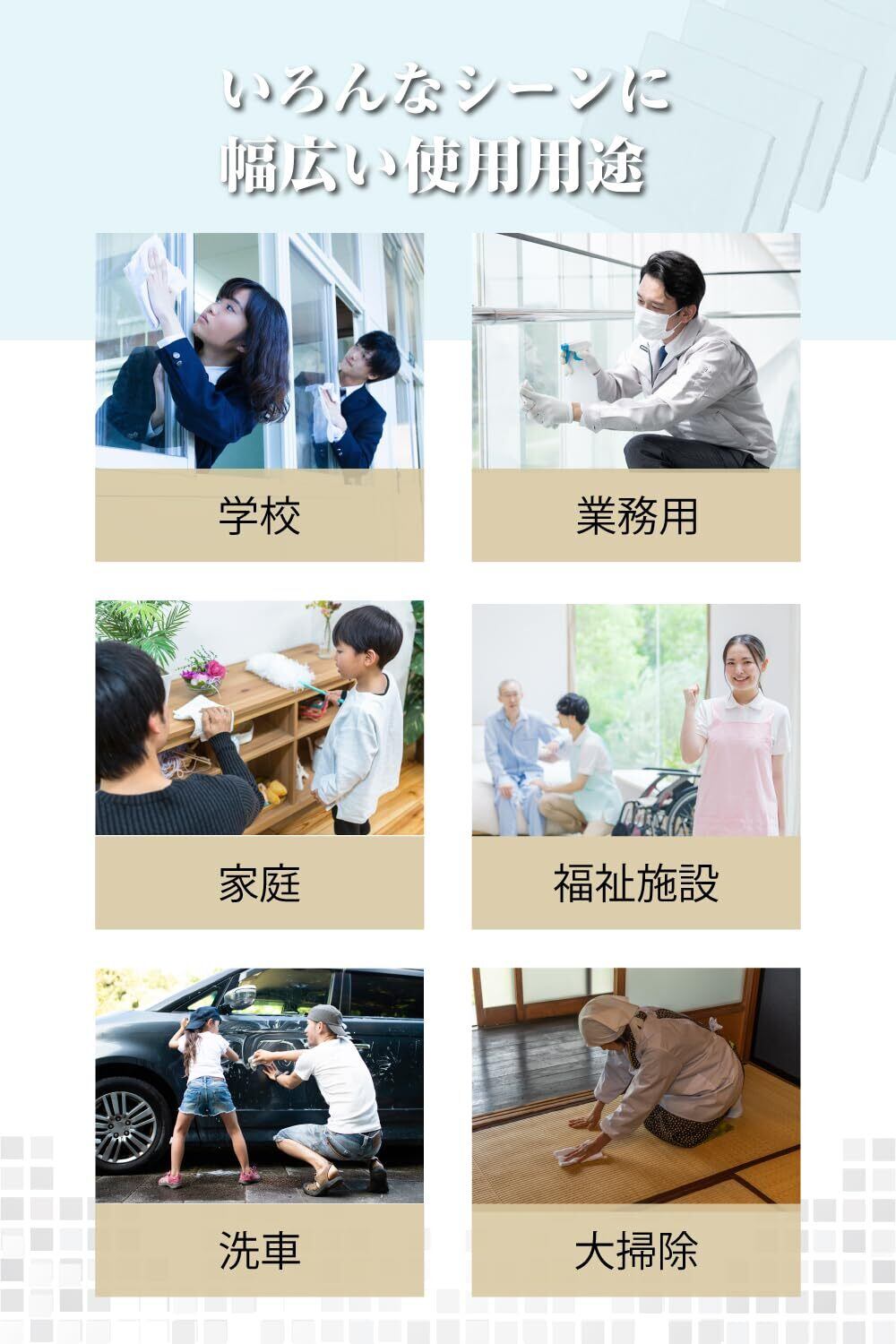 【多用途に活躍】 床拭き、窓拭き、台所まわり、浴室掃除など幅広い用途に最適。学校や幼稚園でも活用できます。