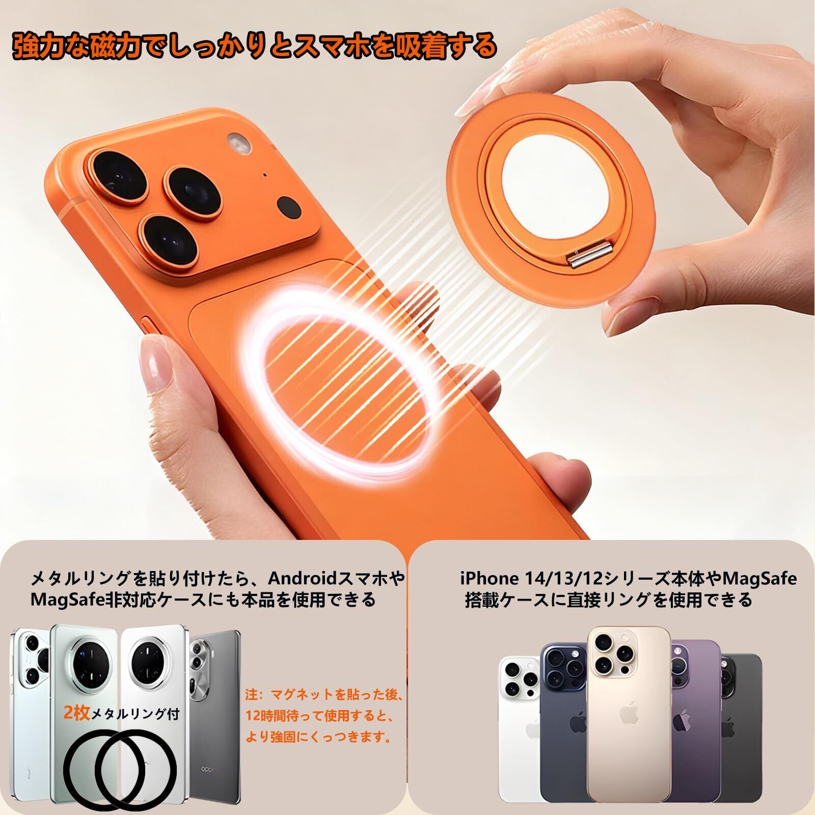 スマホリング マグセーフリング【軽量で薄型】360度回転 マグネット リング 薄型 に対応 磁気増強 Magsafe マグセーフ iphoneリング マグセーフリング スマホスタンド メタルリング スタンド機能 角度調整可能 メタルリング付き 取り外し に12 Pro Max iPhone 13 /14/ 15 /16/17シリーズ Androidに対応 (オレンジ)