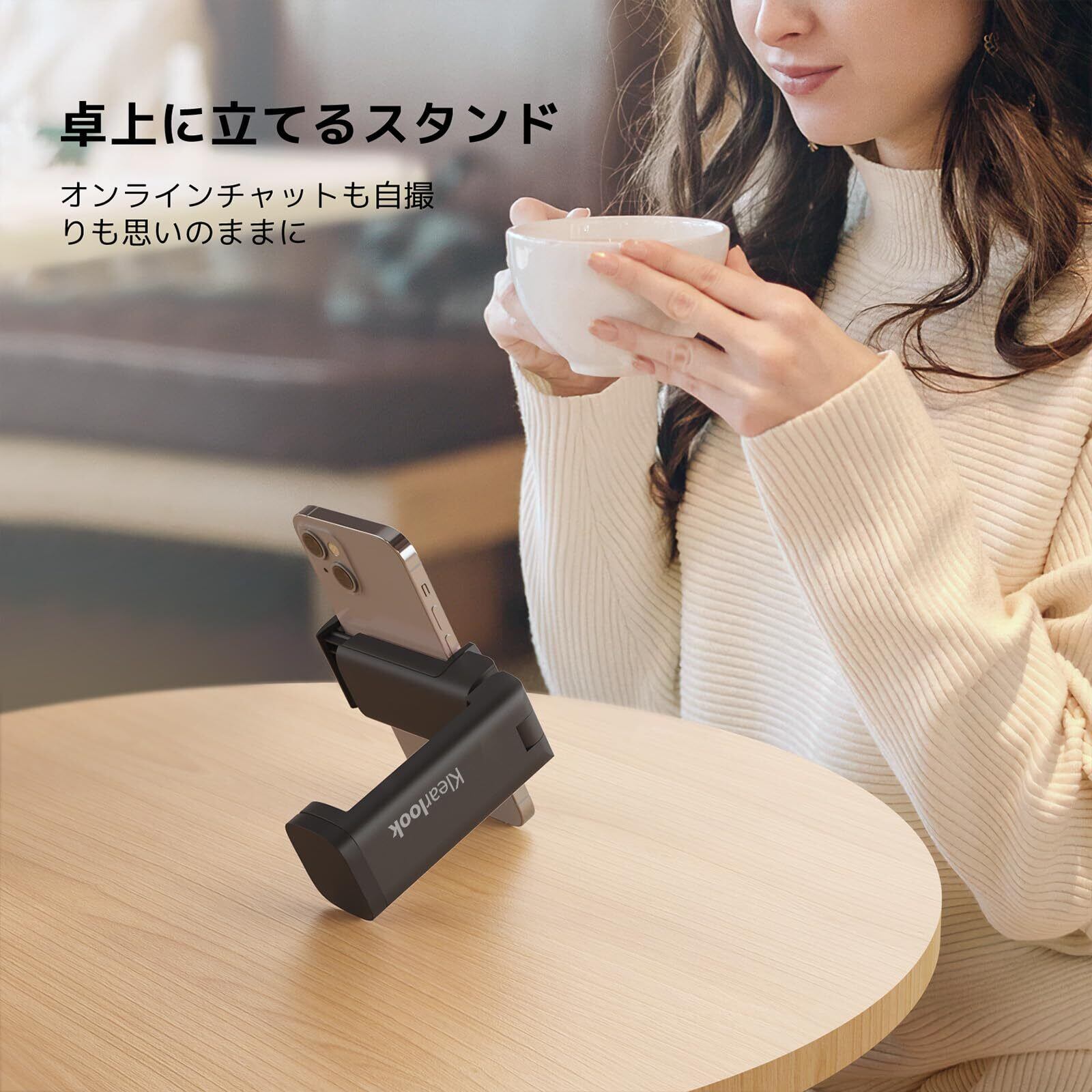 【使いやすい】使用方法としては、まず本製品を開いて、上部のホルダーでスマホを固定し、下部のクランプを開いて机の端に取り付けます。コンパクトなサイズで、簡単に収納できます。折りたたんでポケットに入れて、どこにも持ち運ぶことができます。