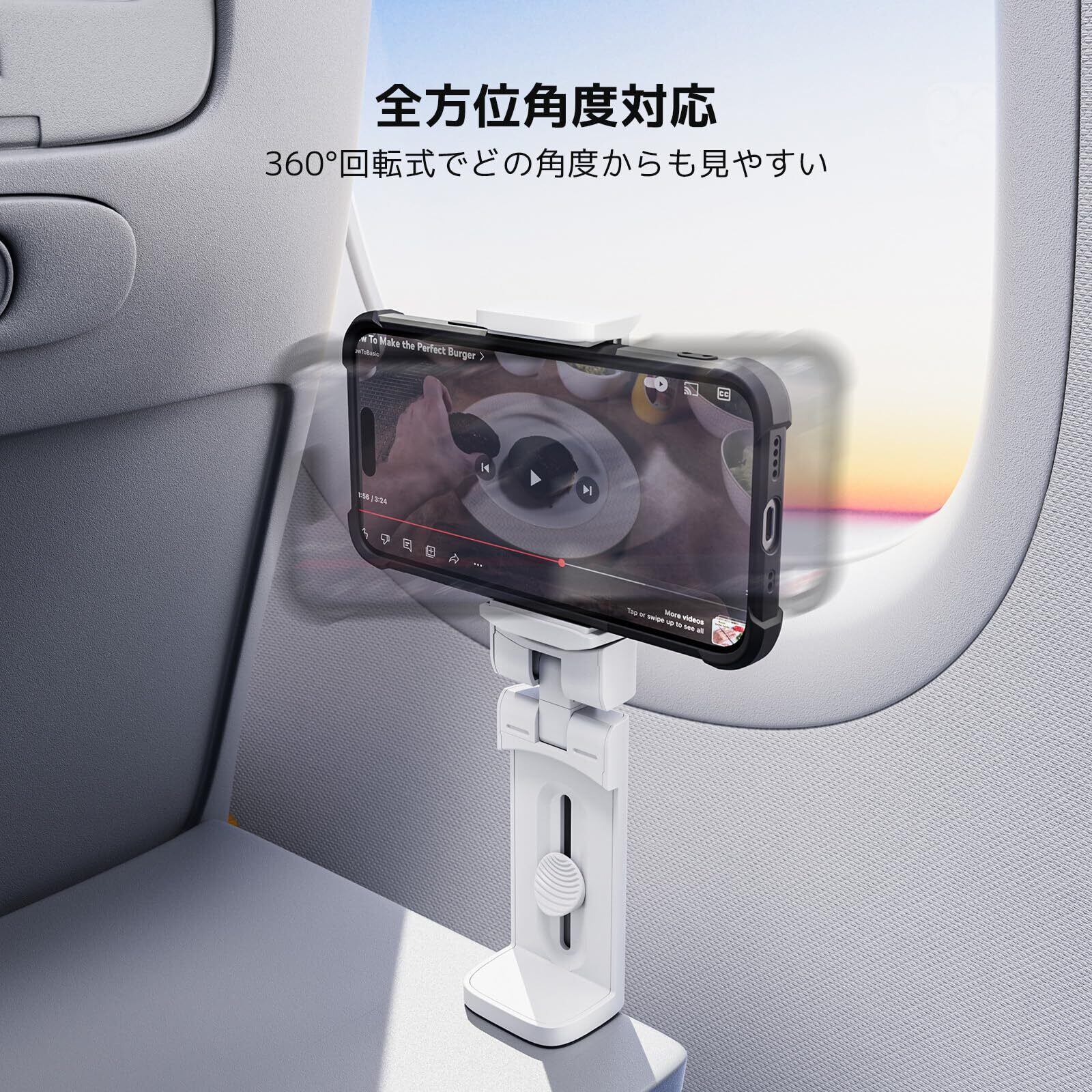 【各場所で大活躍スマホホルダー】卓上、デスク天板の端、飛行機客室の折りたたみ式トレイ、スーツケースのキャリーバー、どこでも設置可能です。オフィス、ベッドサイド、キッチン、ジム、ホテル、車内などの場所で、両手を解放して自撮り、動画視聴、ビデオ通話などを楽しみます。