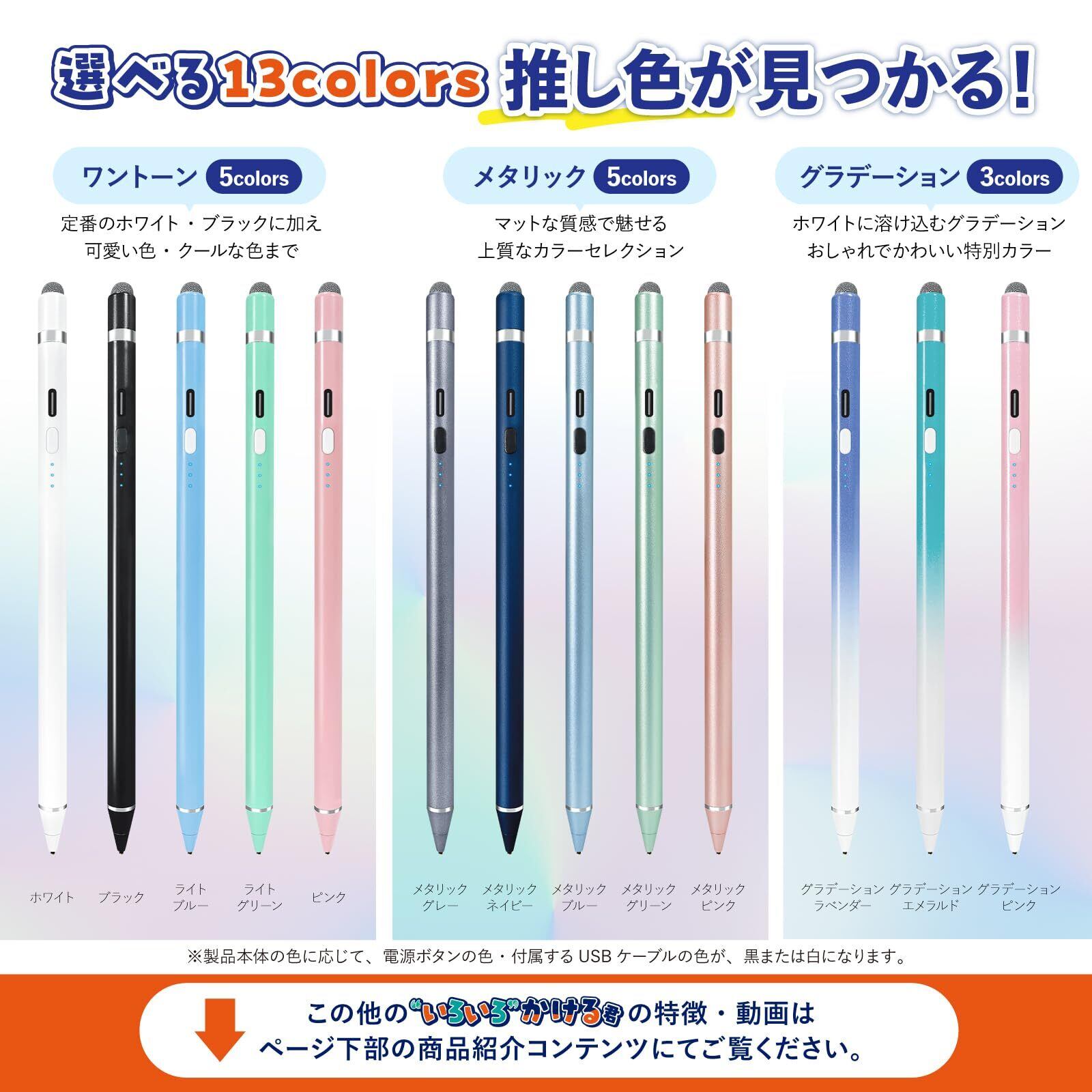 【対応機種】:iPad(アイパッド)などのタブレット、iPhone(アイフォン)、Android(アンドロイド)などのスマホに対応しています。※本製品は様々な機種に対応しておりますが、汎用タイプのタッチペンの特性上、機種や使用アプリ、または個人の感覚によっては、遅延を感じる場合がございます。【いろいろかける君 セット内容】:タッチペン×1本、交換用導電繊維ペン先×1個、充電用USB type-Cケーブル×1本、取扱説明書 ※1.充電用type-Cケーブルの色は本体色によって異なります。