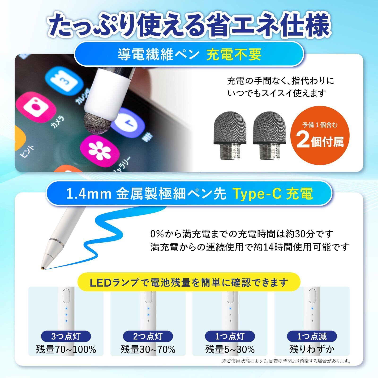 【導電繊維ペン先】:導電繊維ペン先は、充電不要で指代わりに使用するのにピッタリ。手袋着用時やネイルやハンドクリームで操作しにくい時も、快適なタッチ操作を実現します。ペン先は交換可能です。【1.4mm金属製極細ペン先】:金属製極細ペン先は、耐久性の高い銅製で、長時間使用しても摩耗しにくく、交換の必要もありません(交換不可)。簡単なメモ書きなどにご使用ください。