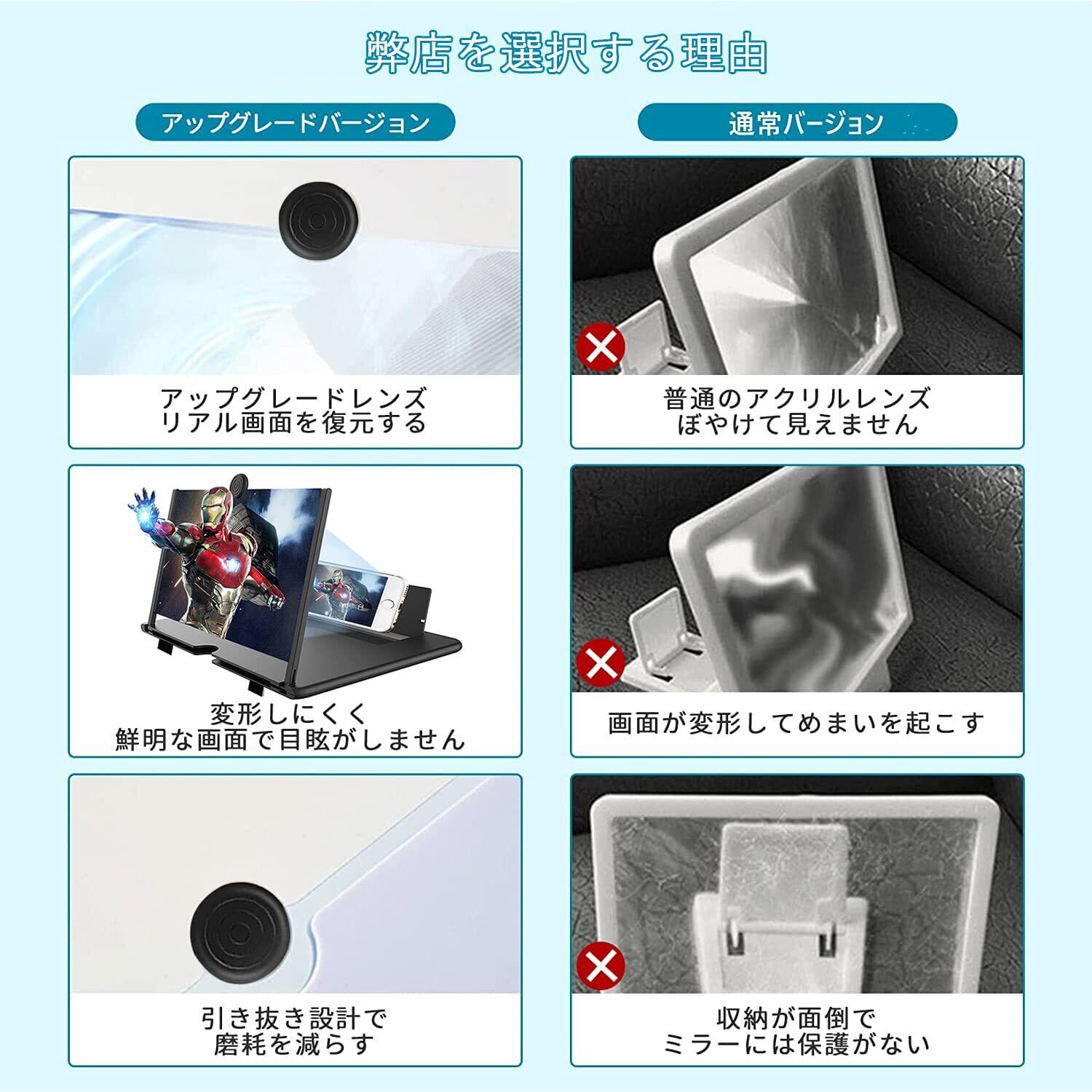 【高品質と耐久性】高品質のABS材料を使用して、無毒無臭、省エネルギーで、環境にやさしくて、操作しやすいスクリーンアンプです。映画を長期的に見る時に不快感や視覚疲労を軽減し,電池なしで省エネを実現します。携帯電話のルーペは最新で高品質のABS材料とフレネルのねじのレンズに昇格して、同時に他の種類の同種の製品よりも、スクリーンを傷つけず 耐久性に優れています。