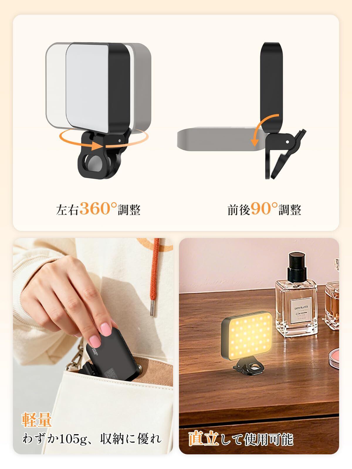 【多方向調整&超軽量設計】スマホライトは左右360°の回転、前後90°の調整を自在に行え、光の照射角度をシーンに合わせて微調整いただけます(例:デスクに直立させてオンライン会議にお使いいただく場合、45°斜め上方に設定して自撮りの鼻下影を消す場合など)。約105gの超軽量設計で、持ち運びの負担を大幅に軽減いたします。コンパクトサイズなので、ハンドバッグやポケットに収納いただけます。旅行先のロケ撮影やカフェでのブログ取材など、外出先でも簡単に持ち出して活用いただけます。