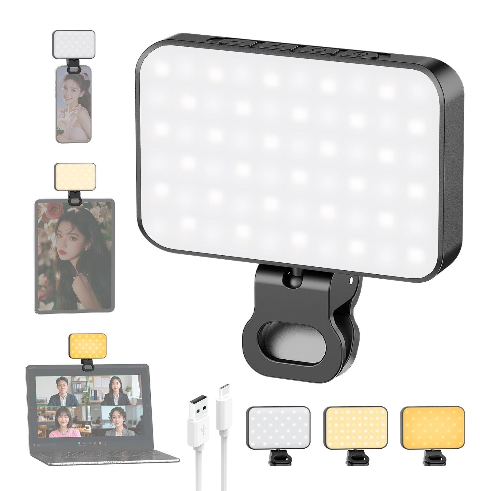Smiling Shark自撮りライト 【クリップ&直立両用・60個LED灯珠·最大30時間使用】 スマホライト 女優ライト 高演色CRI90+ 美顔照明 3色10段調光 クリップ式 直立可能 左右360° 上下90°調整 2000mAh 充電式 残量表示 105g小型軽量 自撮り・動画撮影・オンライン会議に最適 Zoom/YouTube/TikTok補光ライト 撮影用ライト 日本語取扱説明書 黒