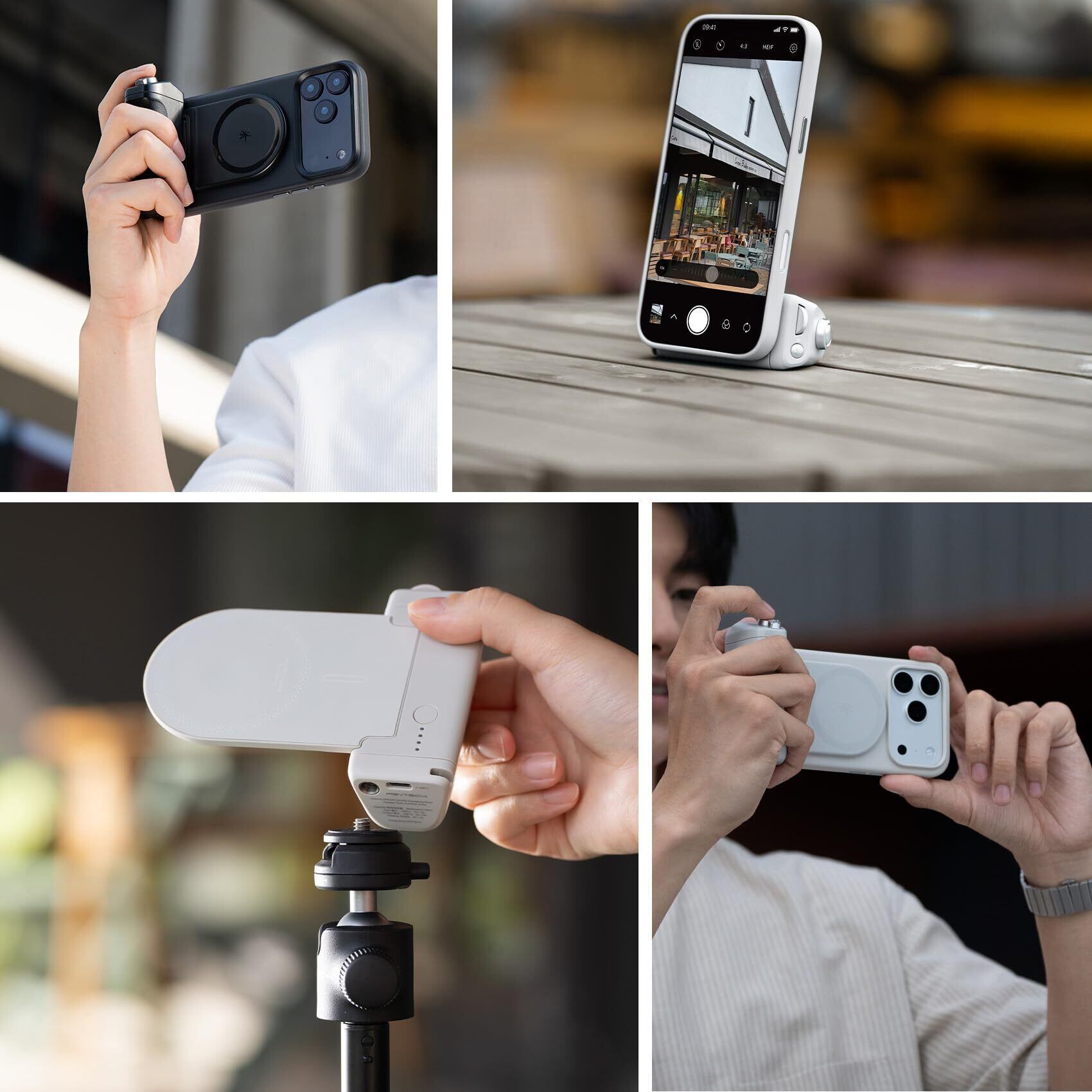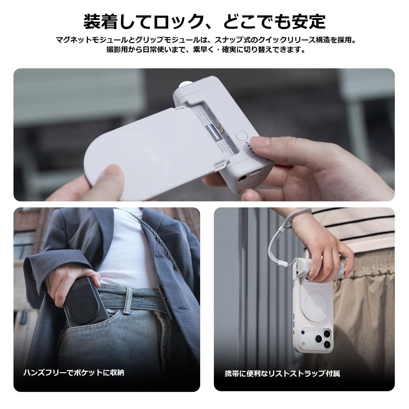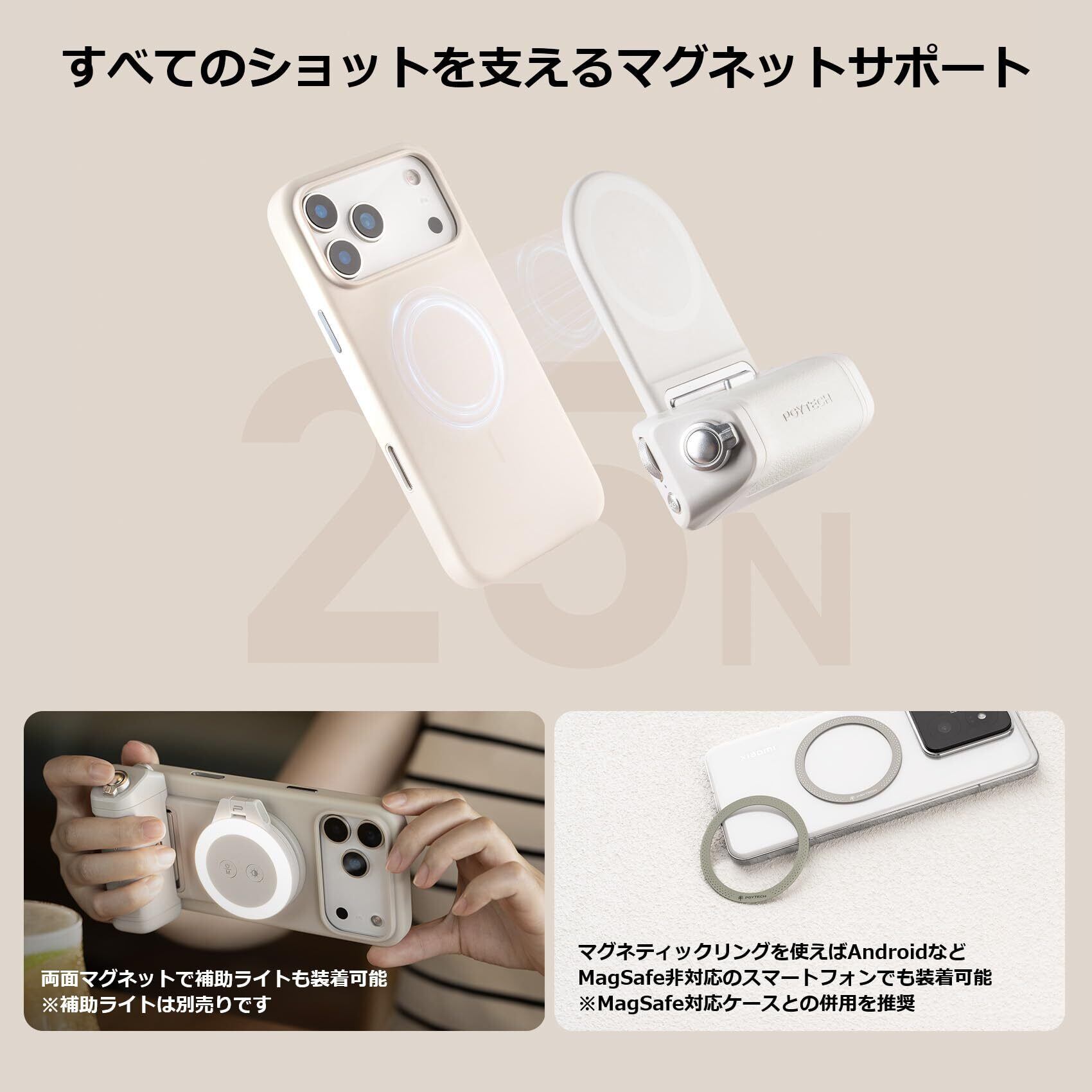 【モジュール式設計の進化で、より快適な撮影体験】 MagCam 2は、従来モデル(MagCam 1)のモジュール式コンセプトを継承しつつ、各モジュールの安定性と操作性を全面的にアップグレード。Bluetoothリモコン、充電ハンドル、ワイヤレス磁気スタンドの3モジュールを単体・組み合わせの両方で使用可能。クイックリリース構造により着脱がさらにスムーズになり、撮影中はスマホスタンドとしても安定して使用可能。横向き・縦向きの切り替えにも対応し、日常撮影から本格撮影まで幅広く対応します。※多機能モデルのため、ご使用前に必ず製品パッケージ内の取扱説明書をよくお読みいただくか、画像内のQRコードをスキャンして電子版マニュアルをご確認ください。