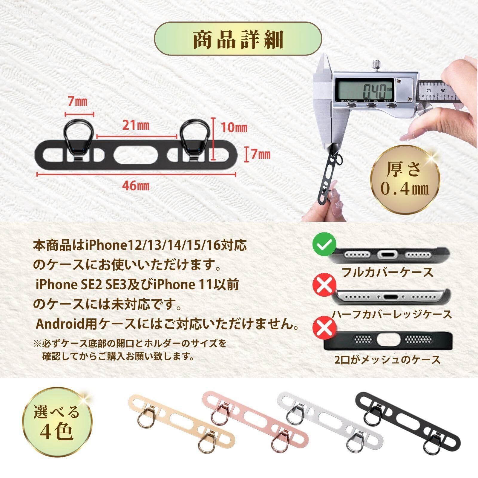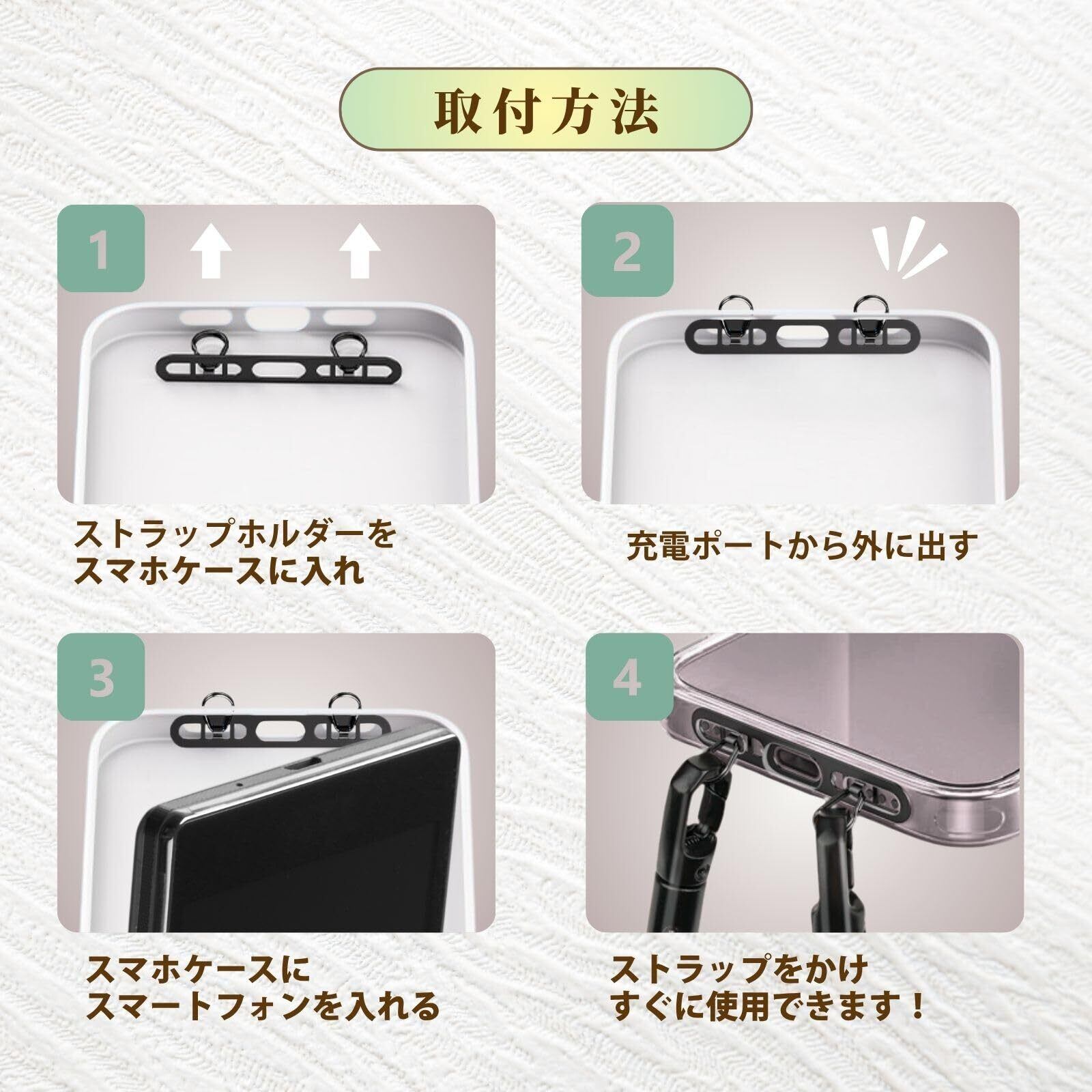 スマホの落下をしっかり防ぐ、極薄0.4mm設計のストラップホルダー。ケースの間に挟むだけで簡単に取り付けでき、装着したまま充電もOK。高品質なステンレス素材を採用し、優れた耐荷重性とサビに強い仕上がりで長く使えます。2口タイプのダブルリング仕様で、ショルダーやハンドストラップなど複数装着にも対応。スマホショルダーや斜め掛けにも最適な、洗練されたデザインの便利アイテムです。
