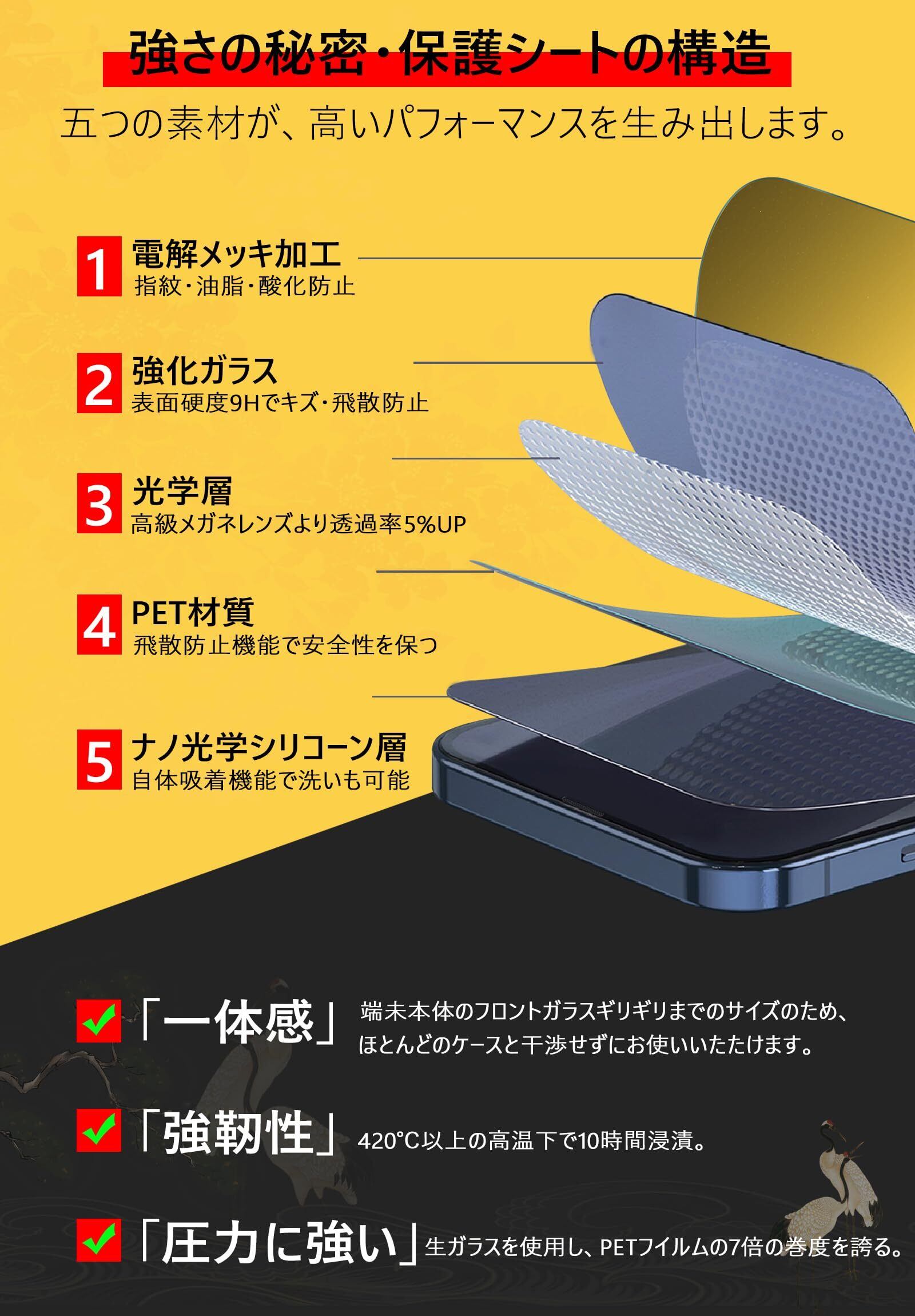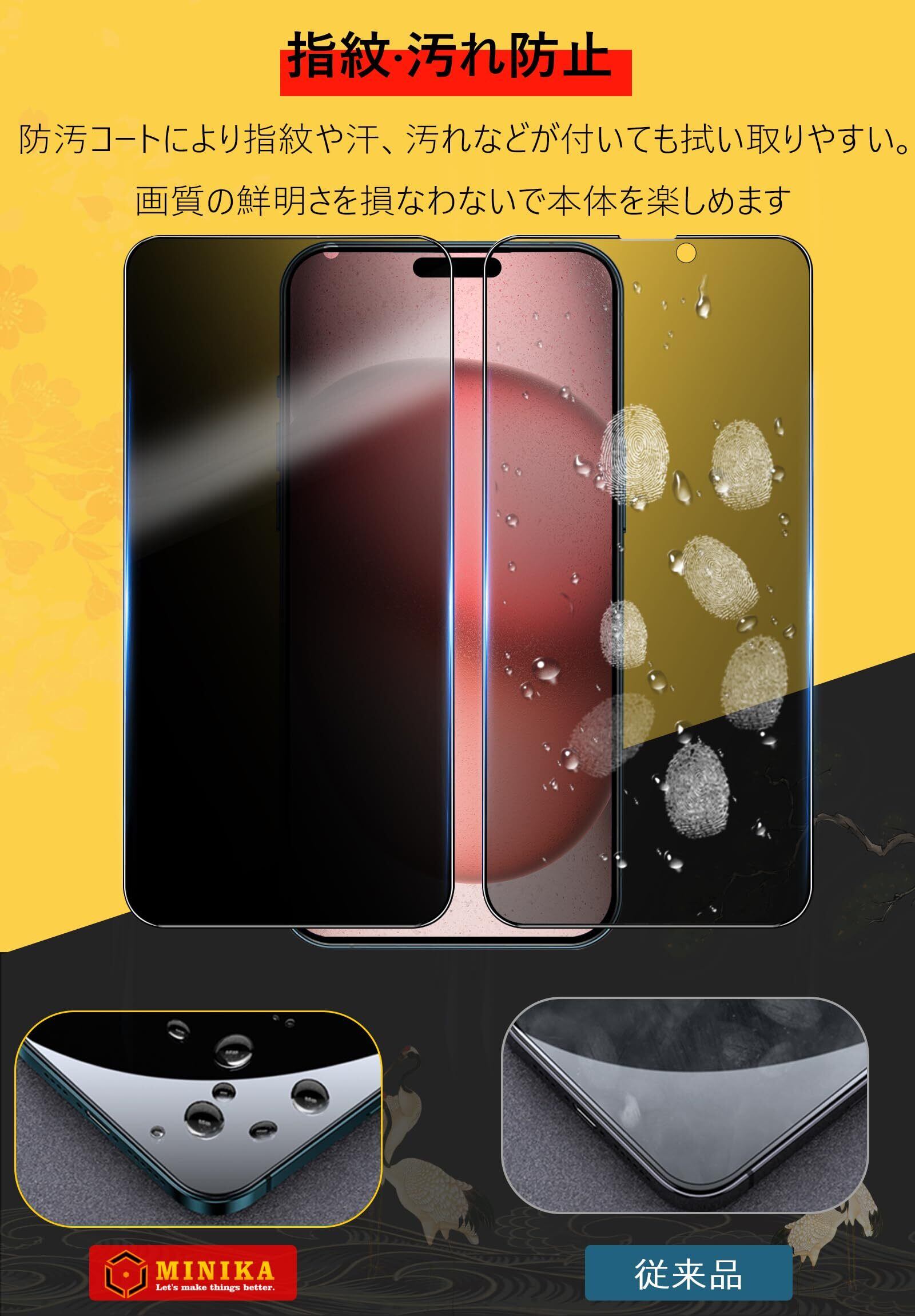 【指紋防止、飛散防止】 MINIKAのiPhone15用ガラスフィルム,撥油コーティング加工されているため、ホコリや指紋など汚れにくくなっています。付着しても簡単に拭き取れます。画面を美しいままに保つ、スムーズな操作が可能です。ガラスフィルムは飛散防止加工されておりますので、万が一割れの場合でも、飛び散らず張り付いた安全の状態になります。