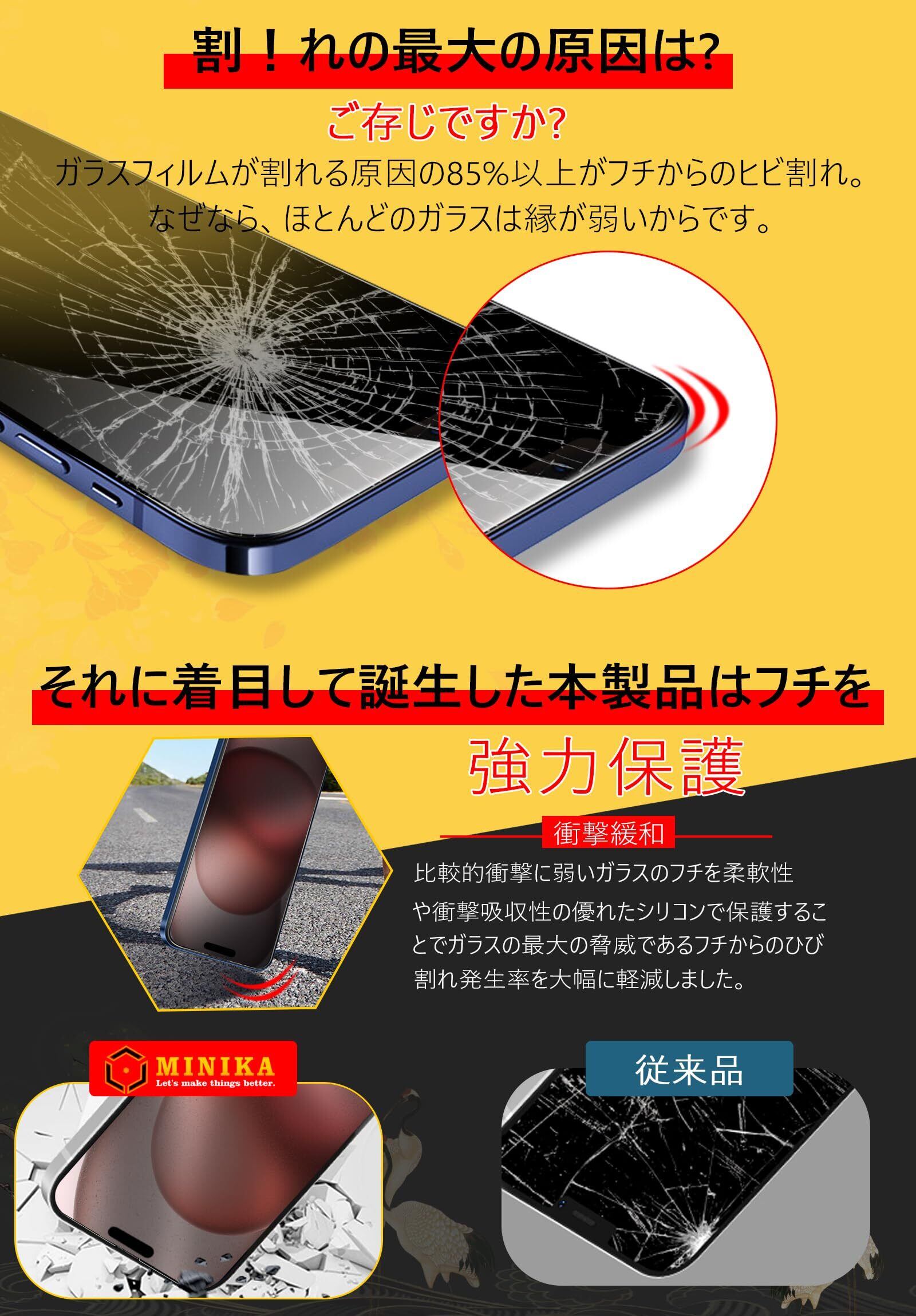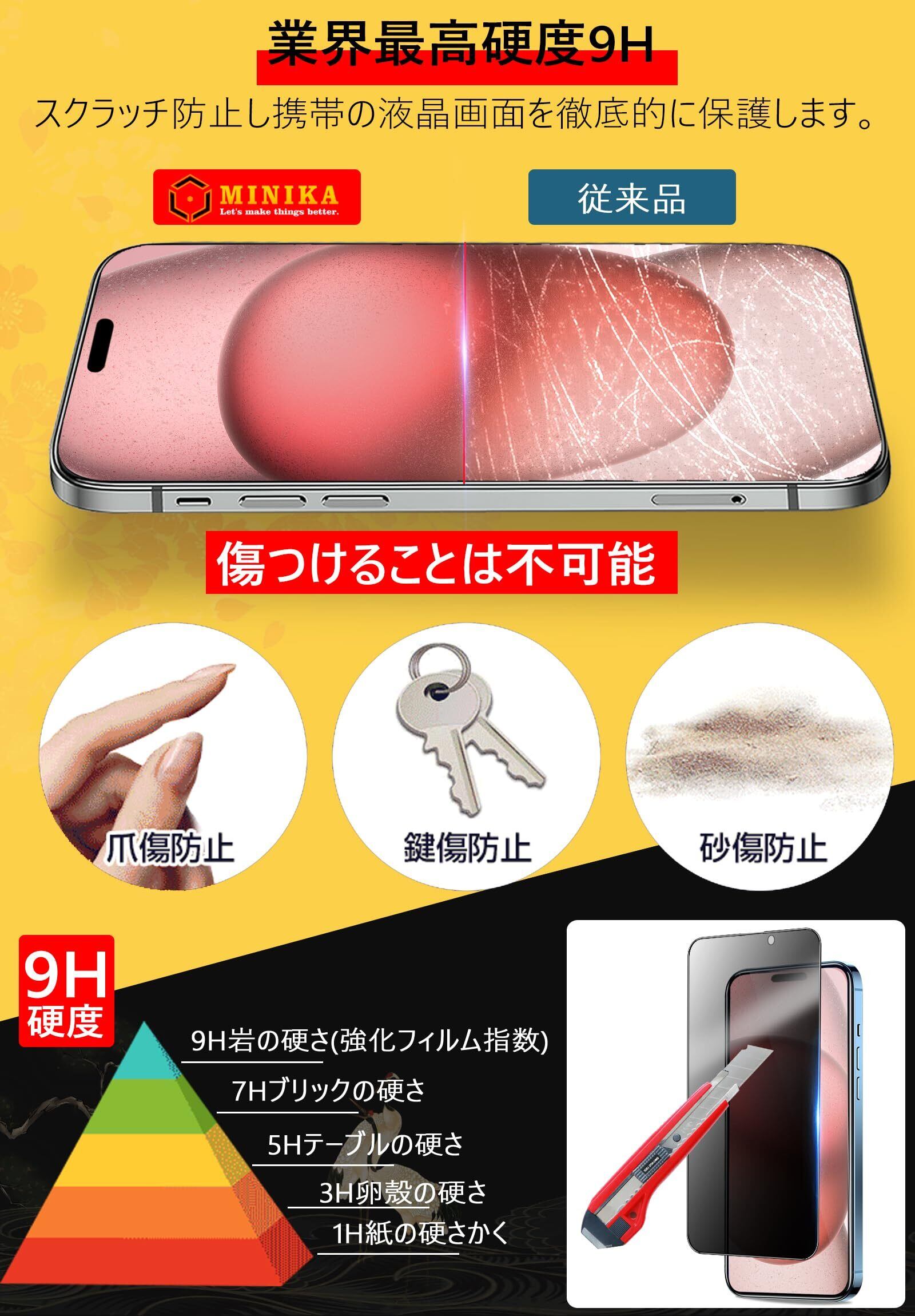 【硬度9H、保護力3倍Up】 MINIKAのアイフォン15フィルム一般的な製品に比べ3倍以上の保護力があり、画面の破損を最低限まで抑え、衝撃を受けても割れにくい。優れた耐スクラッチ性能:硬度9Hのフィルムが日常的なスクラッチから守り、傷を付きにくくします。