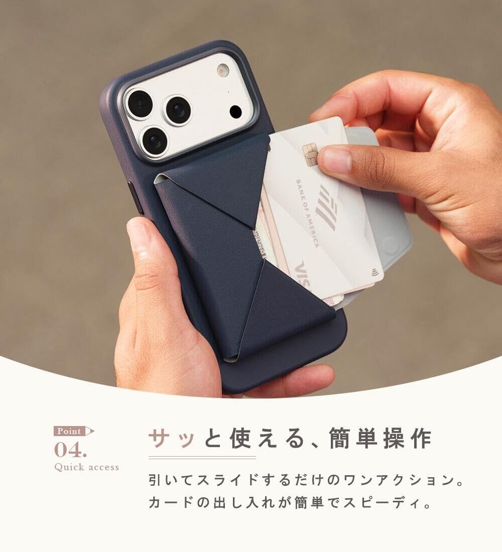 【ワンアクションでサッと取り出し、日常を効率化】 仕切り構造とプルタブ付きで、カードの出し入れはワンタッチ。折りたためばスタンドとしても使用でき、動画視聴やビデオ通話をより便利に楽しめます。