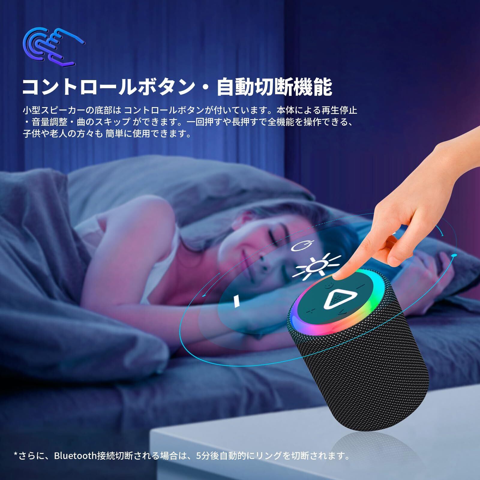 【自動切断機能&ダイナミックライト】Bluetooth接続切断あるいは再生しない場合は、10分後自動的に切断し、スピーカーの電量を節約します。このスピーカーのライトは複数段階で調節できます、内蔵されたライトエフェクトは音楽のリズムに合わせて自動的に変化し、パーティーやイベントを華やかに演出します。ロマンチックな雰囲気を作り出す夜のライトとしても使用でき、休日やお祝いの日に最適です。