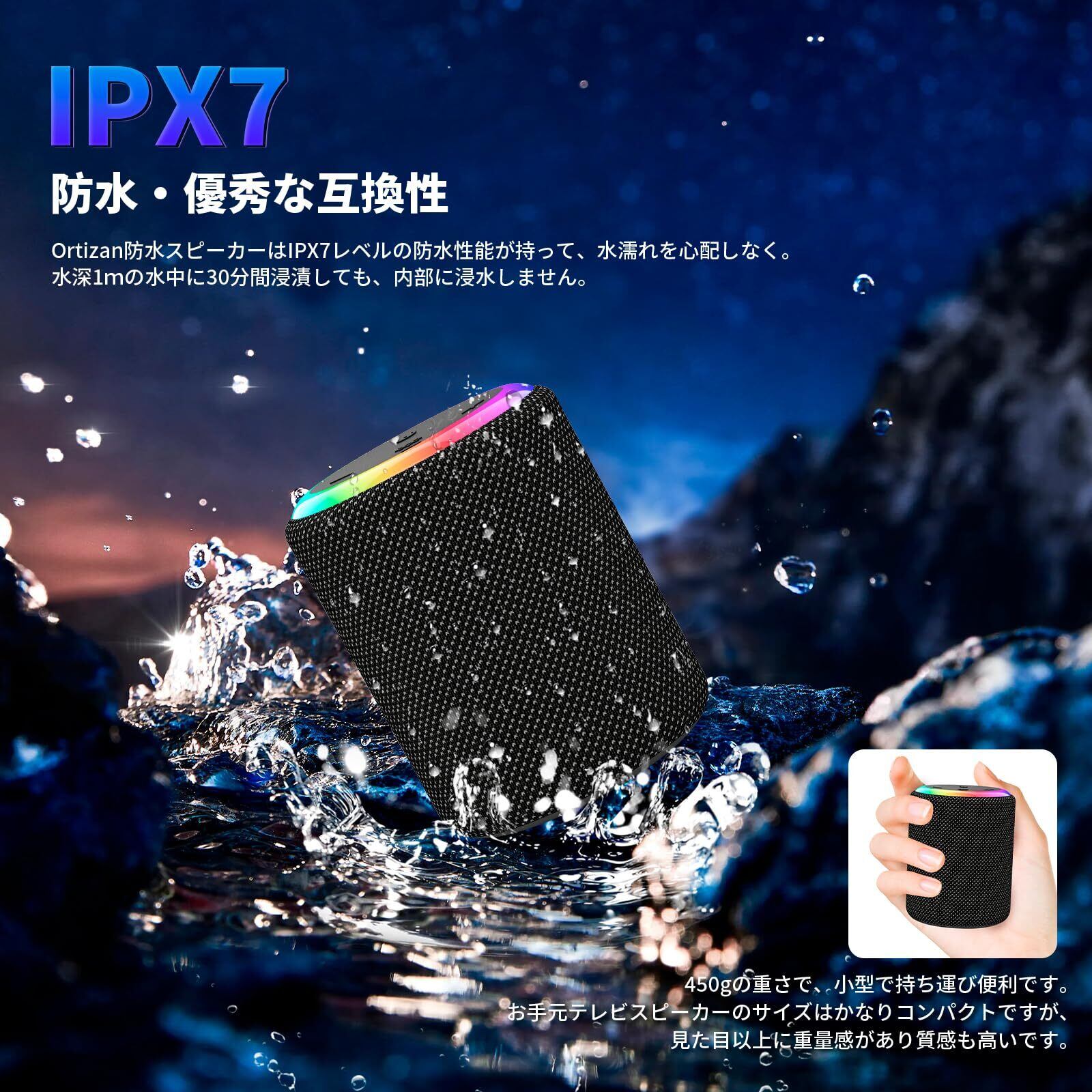 【IPX7防水設計&小型でポータブル】IPX7防水規格に準拠しており、環境性能と運動性能、を両立して水しぶきや雨に強い設計です。お風呂場やキッチンなどの水回りでも安心して使用できます。318gの重さで、小型で持ち運び便利です。バッグやリュックに簡単に収納でき、どこにでも持ち運べます。