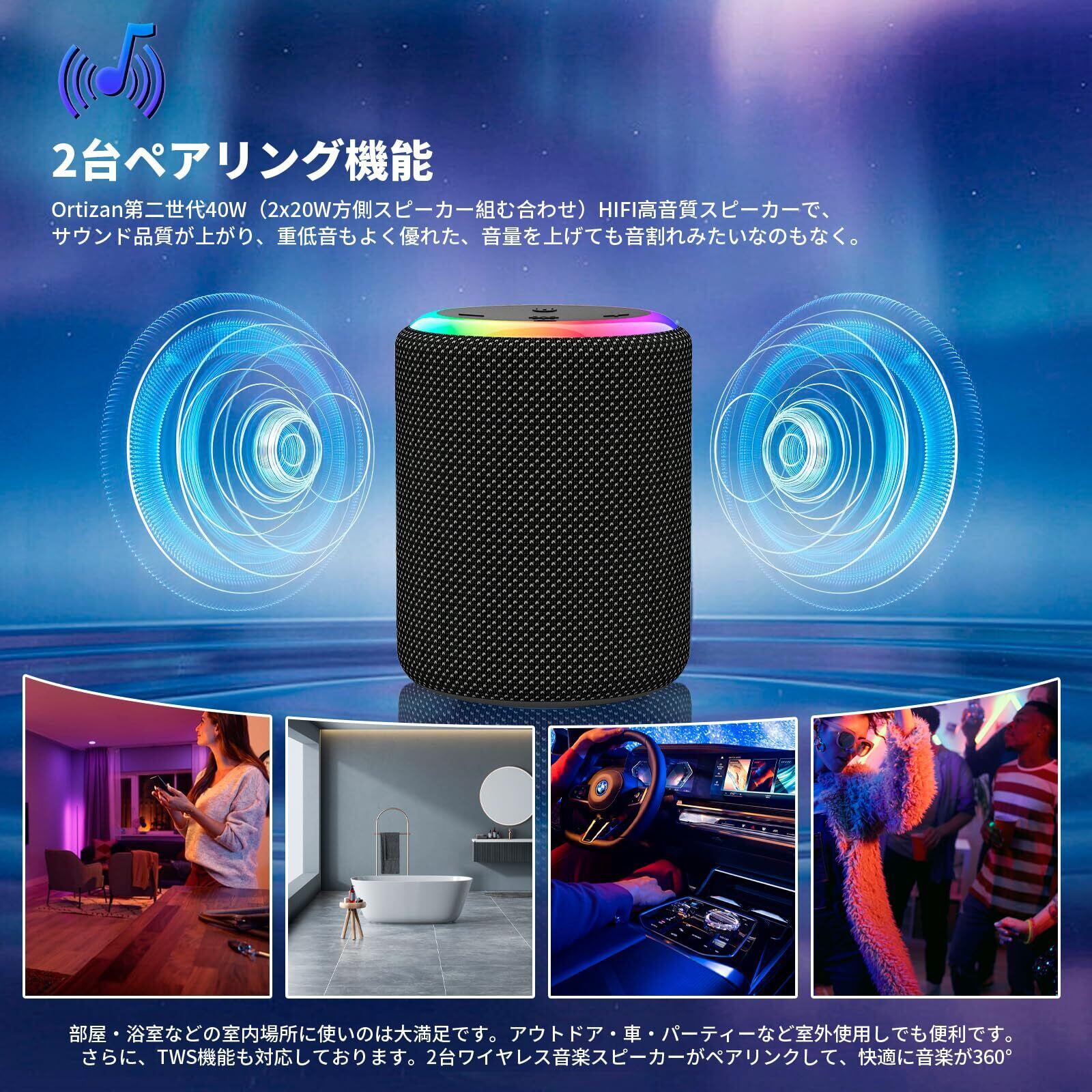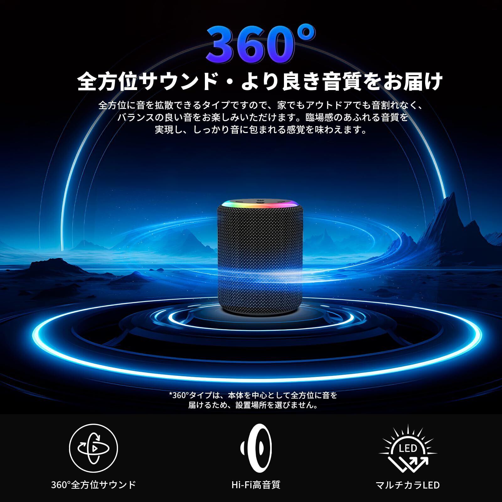 【360°立体声操作&2台ペアリング機能】コンパクトなデザインで驚異的なサウンドを体験できます。このBluetoothスピーカーは、鮮明な高音、まろやかな中音域、豊かな低音を提供し、歪みのない臨場感あふれるサウンドを実現します。2つのスピーカーを同時に購入すると、2台ペアリング機能で2つのスピーカーをペアリングして、映画館のような360°ステレオサウンドを楽しんていただけます。