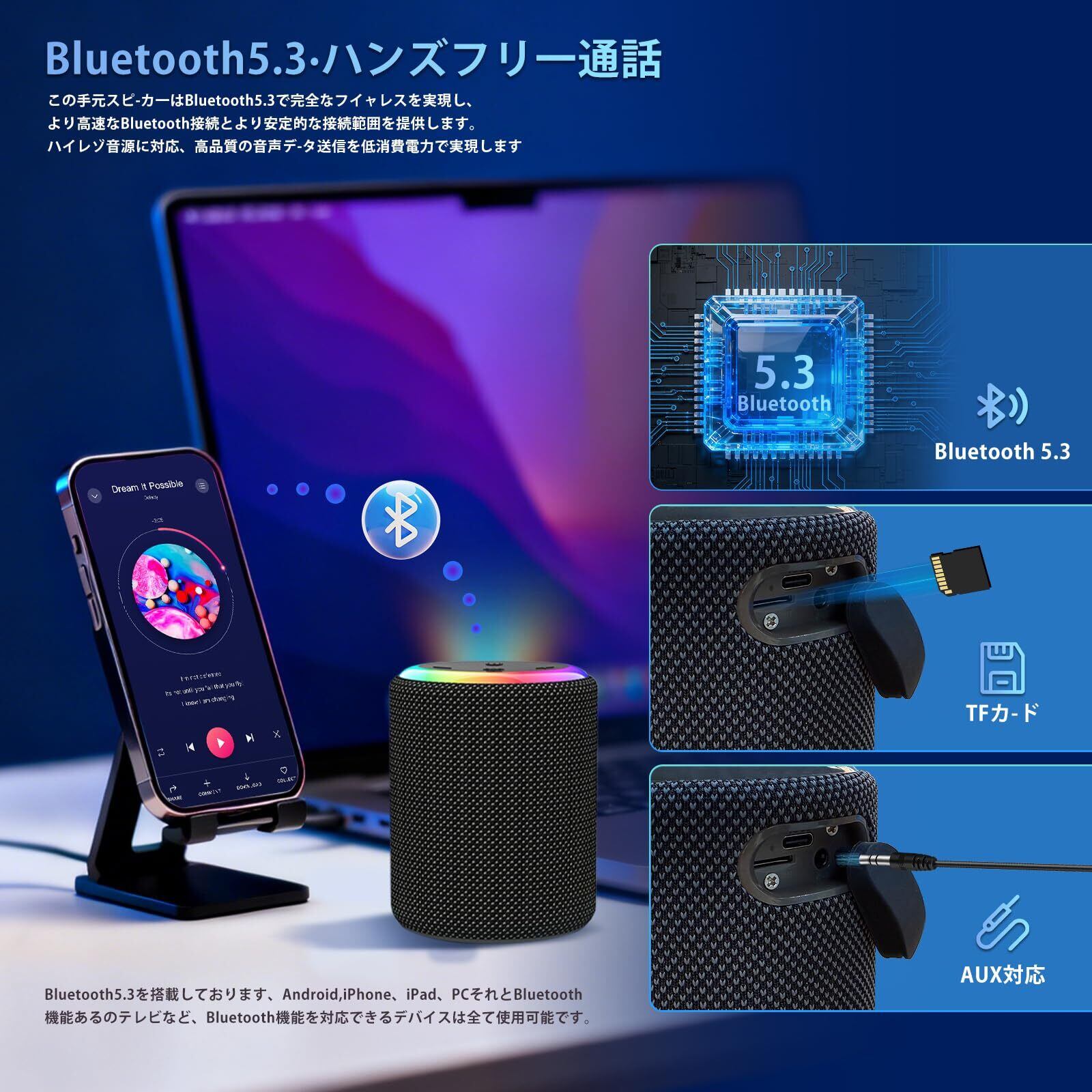 Bluetoothスピーカー ワイヤレススピーカー 小型 HIFI音質 大音量 ポータブルスピーカー【2025年の新アップグレード】 Bluetooth5.3 LEDライト付き Type-C充電 IPX7防水 AUX対応 マイク内蔵/TWS機能/TFカード対応/2台ペアリング お風呂 スマホ PC 車用