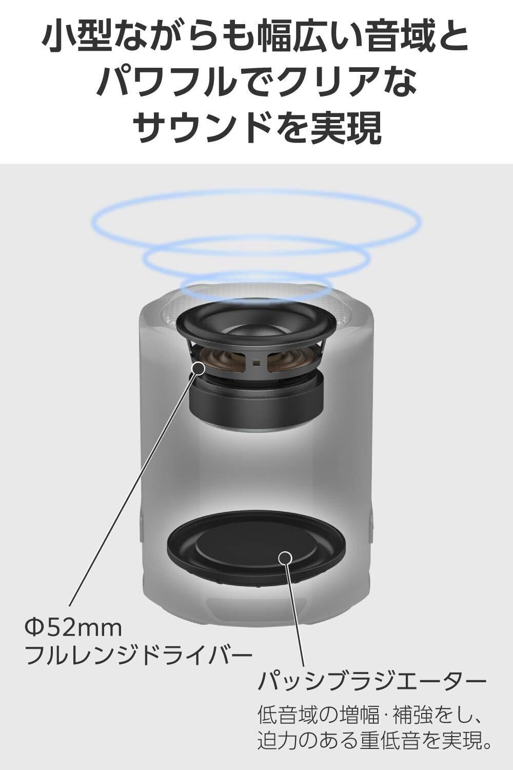 ■最大出力7.5W。φ52mmフルレンジドライバーとパッシブラジエーターを搭載し、パワフルでクリアなサウンドを実現しました。