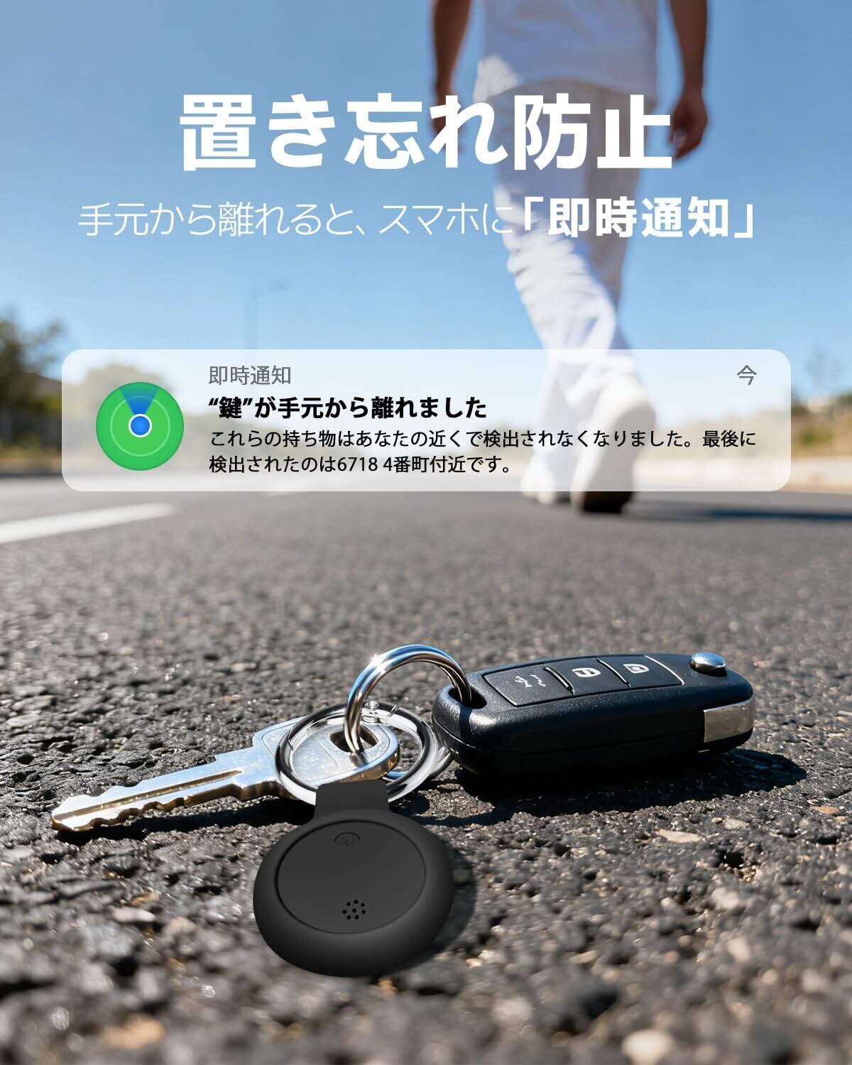【即時通知で置き忘れ】設定した距離を離れるとプッシュ通知が来る!置き忘れた場合はすぐに取り戻しに行きます。【低消費電力・電池交換可能】1年以上持続の長持ちスマートトラッカーです。電池残量をアプリから確認でき、市販のCR2032電池で簡単交換。【IP68防水防塵】最高レベルの防水仕様+防水カバー付き。雨や水しぶきにも強く、普段使いやアウトドアに大活躍。