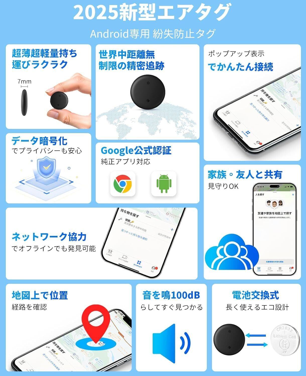 【Android専用&Google公式認証】従来のAndroid対応スマートトラッカーは非公式アプリのダウンロードが不要、この製品はGoogle認証を受けたAndroid専用のスマートタグです。純正のGoogle「Find Hub」アプリを使用するので、操作は簡単、データセキュリティも!接続が安定し、全世界GPSで遅延なしの高精度位置測定が可能です!Android 9以降の端末にすべて対応【注意】本品はAndroid専用です。iOS、HUAWEIに対応しておらず、中国、イラン、北朝鮮ではご利用が制限される場合がございます。