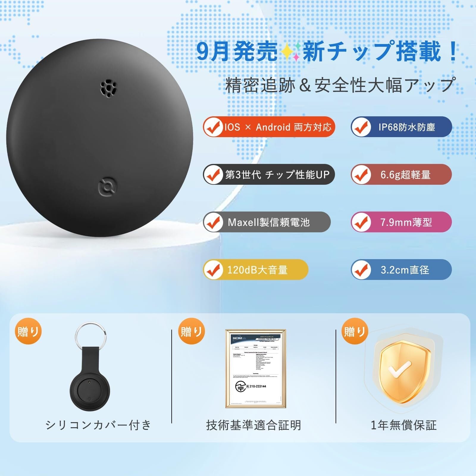 ①✨【第3世代 最強 2in1エアタグ登場!Apple x Google公式認証済み!】Apple x Google公式ダブル認証!IOS「探す」x Android「検索ハブ」対応| 大手Maxell信頼のボタン電池搭載 | 第3世代チップ性能UP| 上質高级感 x 超薄・軽量型 | 技術基準適合 |全球GPS高精度測位 | 120dbアラーム | プライバシー保護 | 1年バッテリー寿命&エアタグ最大10年寿命 | 残量通知&アプリ管理機能! Apple×Google公式認証済み:iOS「探す」・Android「検索ハブ」対応の公式アプリで、安心・安全の高精度測位。厳格な認証をクリアした信頼の性能で、大切なものをしっかり守り。信頼のMaxell製ボタン電池:大手メーカー・Maxell製電池を採用し、長期間にわたり安定したパフォーマンスを実現。確かな1年間の電池寿命を誇り、繰り返し交換で最長10年使用可能なエアタグ。第3世代チップ搭載:処理性能 ・省電力が大幅向上。「長持ち・安定・上質」を大幅に向上し、反応もスムーズ、位置情報もより正確に。超薄マット仕上げ:厚さ0.79cm、軽さ6.6gの洗練デザイン。手に馴染むマットな質感で、日常からアウトドアまでスマートに使え。技適マーク取得で安心・安定の接続&強力なプライバシー保護:日本の技術基準に適合し、IOS・Android両対応で安定接続。位置情報はFind MyとFind Hubの暗号化して、閲覧は本人のみ、履歴は完全秘匿、当社・第三者による個人情報取得は一切なし。安心・安全のセキュリティを約束!