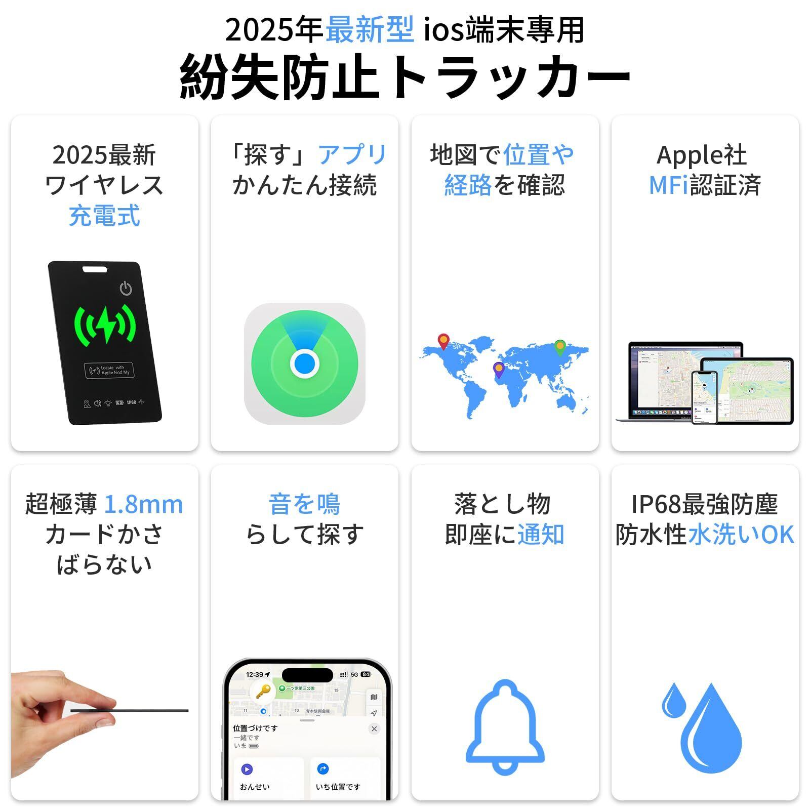 エアタグ カード型 【ワイヤレス充電式&極薄1.7mm】 紛失防止タグ Appleの「探す」に対応(iOS端末のみ) MFi認証品 gps 子供 小型 財布 gpsタグ スマートタグ airタグ 忘れ物防止 タグ 車 スマートトラッカー gpsトラッカー 置き忘れ防止 財布/荷物/ IP68防水 超軽量 日本語説明書付き
