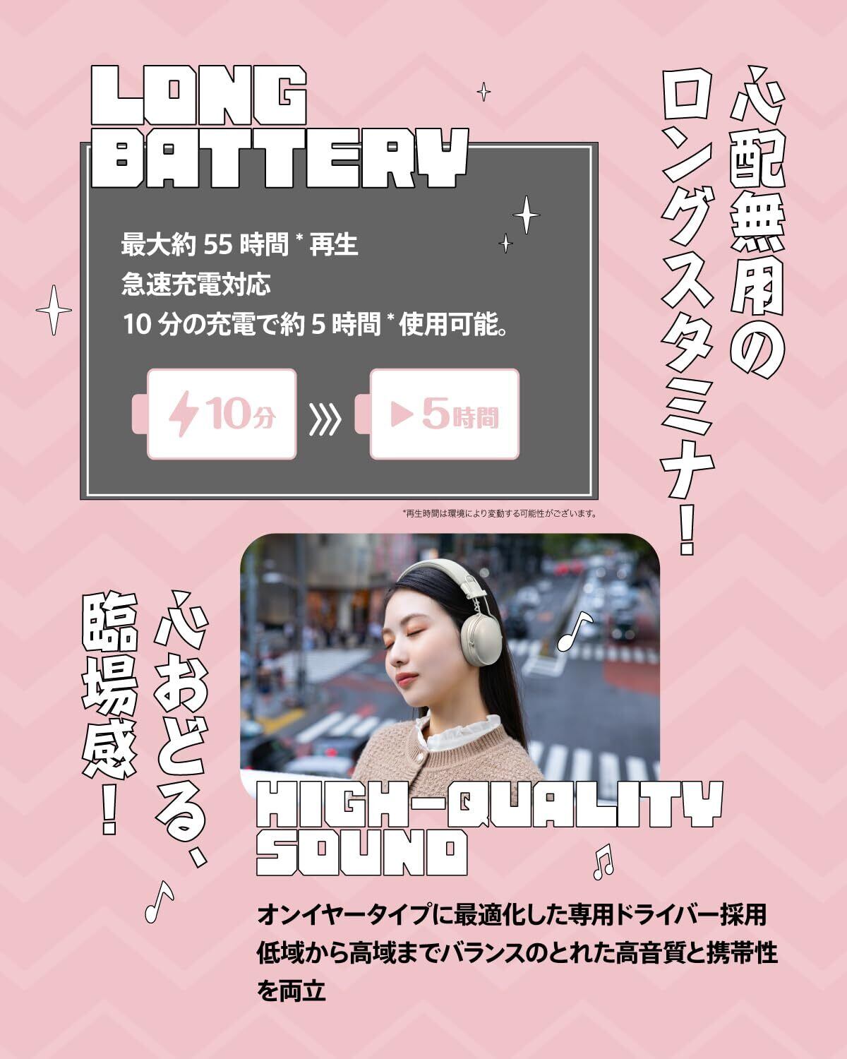 長時間再生&急速充電対応:業界最小・最軽量クラス*ながら、最大約55時間の連続再生が可能。お出かけや旅行、長時間の利用にもバッテリー残量を気にせず安心して使えます。また、急速充電に対応しており、わずか10分の充電で最大約5時間の再生が可能。忙しい日常でも、音楽やビデオを途切れることなく楽しめます。*当社調べ。2024年8月時点。ANC搭載ヘッドバンド型のヘッドホンとして。