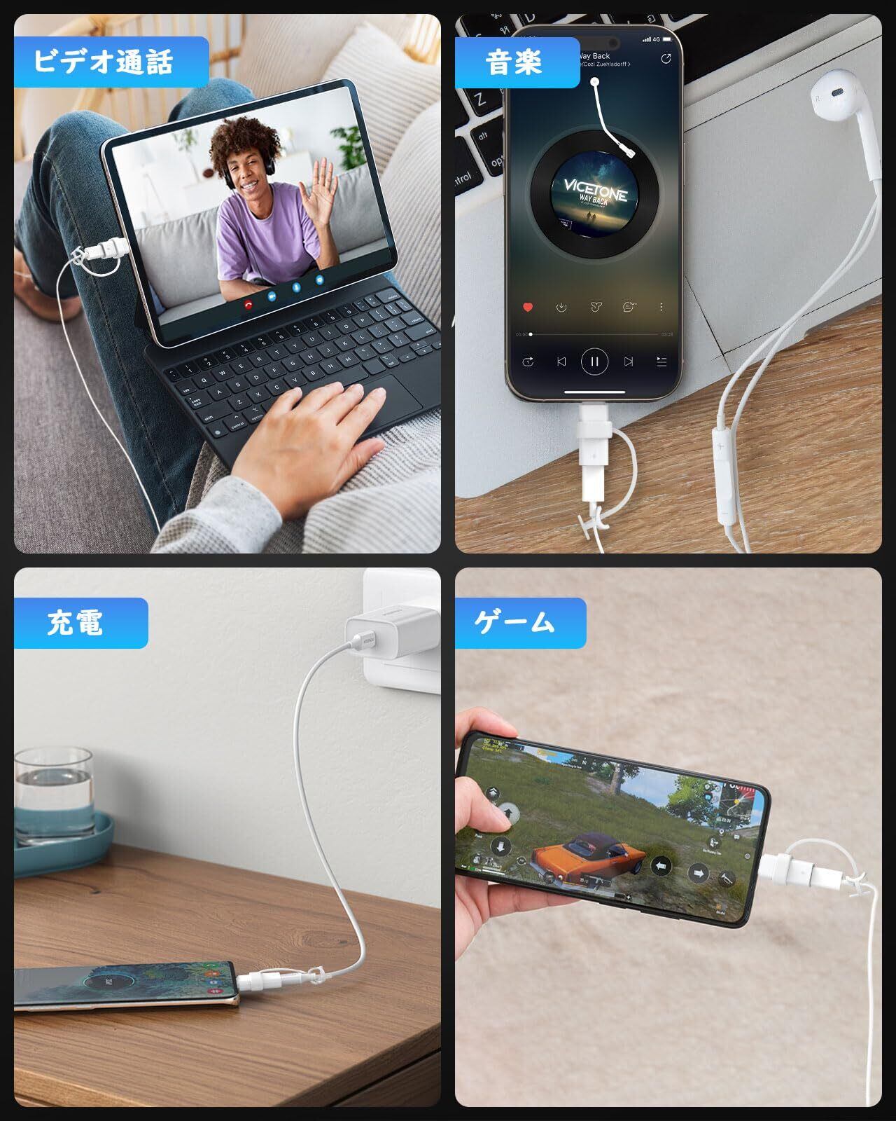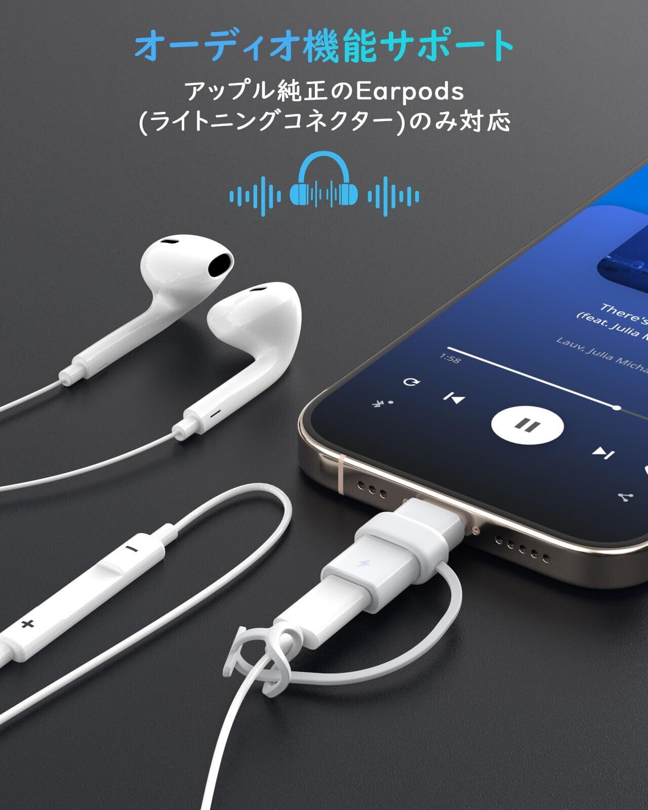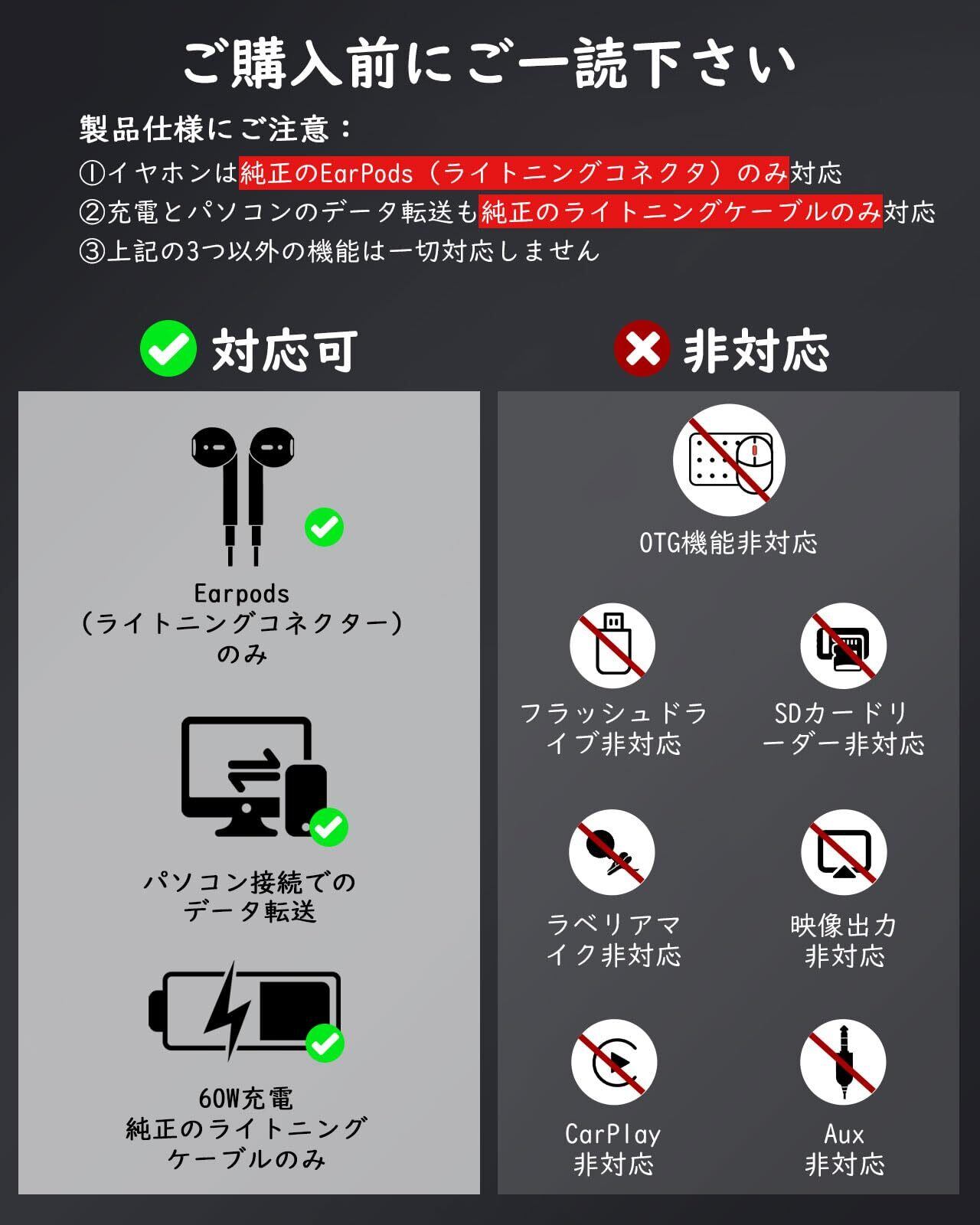 ※【ご注意】①本製品はオーディオ・充電・データ転送機能のみ対応です。OTG機能対応できません(車内AUX/DisPlayPort/HDMI映像出力/USBメモリ/メモリスディック/マウスなどを含め一切対応できません)。②本商品は純正のEarPods(ライトニングコネクタ)イヤホン、及び純正のライトニングケーブルと組み合わせて使用することをオススメしたします。サードパーティのイヤホンやケーブルの場合には正常に動作できない可能性があります。③データ転送はスマホとPC間でのデータ転送のみ対応です。純正ケーブルのご利用を推奨いたします。④ MacbookでTYPE-Cイヤホンを正常に使用できるため、「サウンド出力をUSB-Cデバイス」 に設定してください。