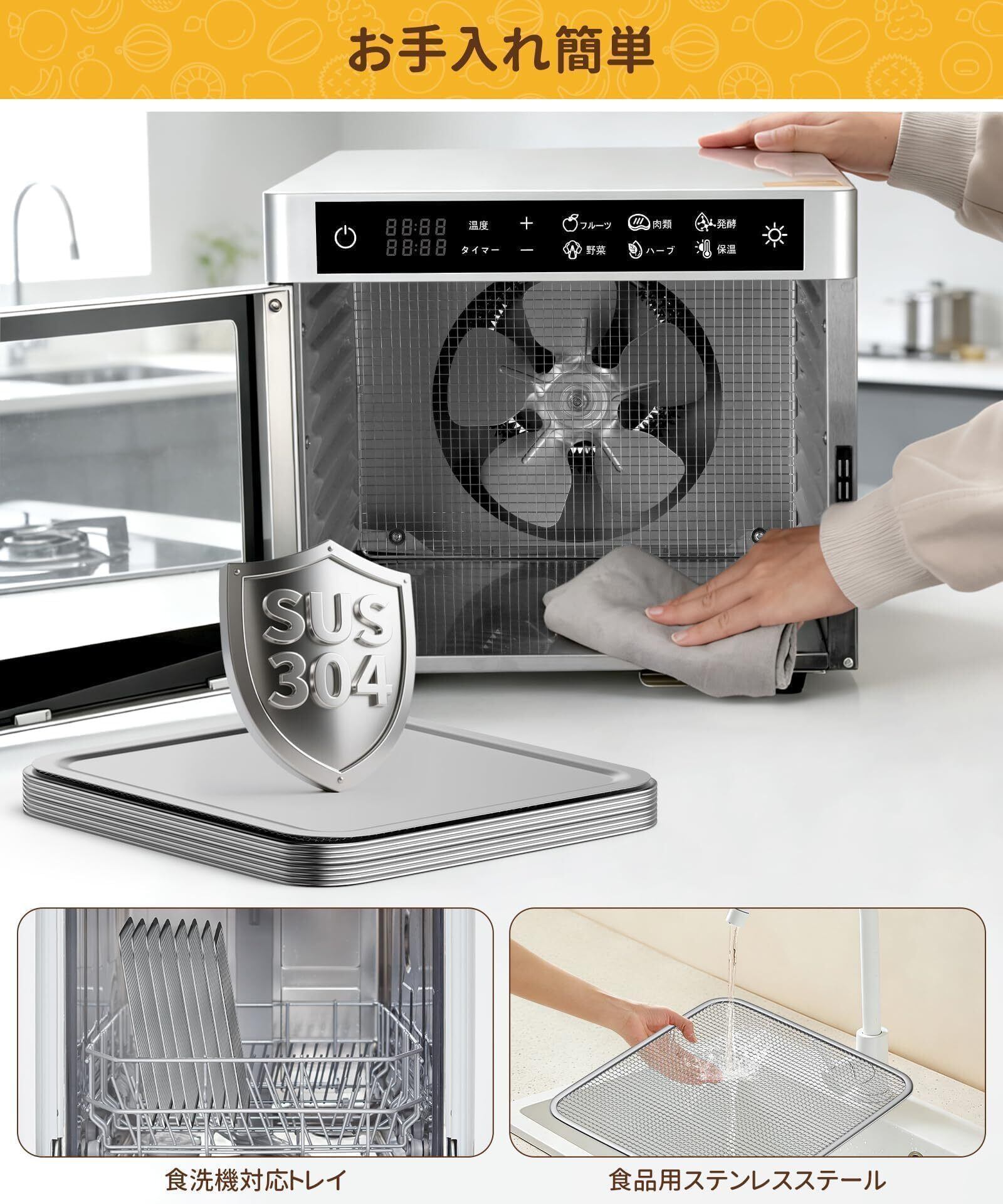【業務用耐久性|付属品充実で即実用可能】ダブルステンレス構造により高い耐久性を実現し、家庭用から業務用まで長期間の安心使用をします。8段のステンレストレイは配置の自由度が高く、キノコからハーブまで多彩な食材に対応。断熱手袋、シリコンシート8枚、専用トング、日英バイリンガルレシピ2冊、日本規格プラグ付き電源コードをすべて同梱し、開封後すぐにご使用いただけます。野菜乾燥機としてもフード乾燥機としても、発酵・保温機能も含め、さまざまな食材の保存と加工に対応します。