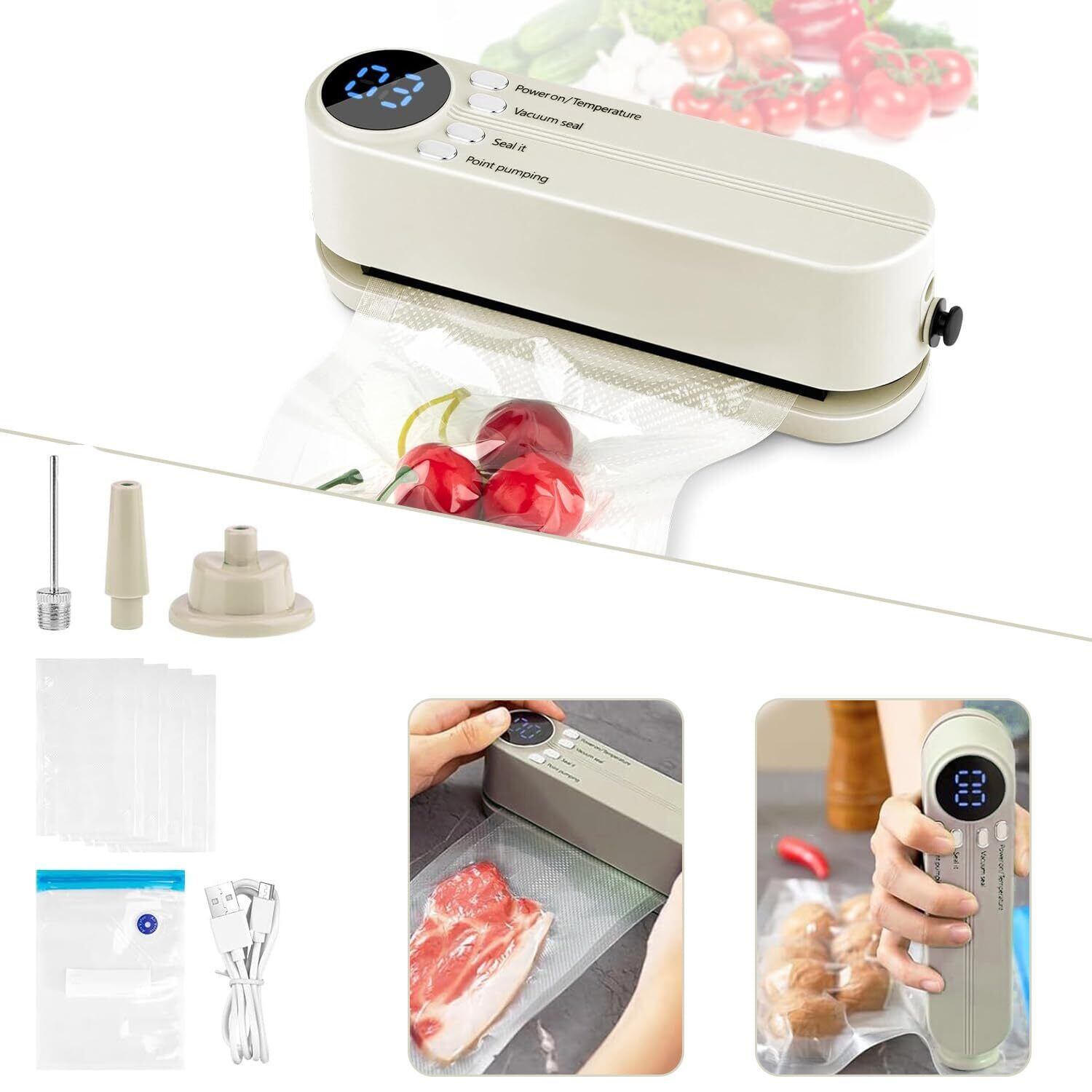 【4in1多機能真空パック機】真空パック機は真空シール、シールのみ、脱気、エア注入の機能が搭載されています。多種の食材に使用でき、肉、魚、野菜、果物、お菓子などの鮮度をキープしたり、真空保存にもこの一台で対応できます。付属の吸引ノズルと針により、バスケットボール、サッカーボール、水泳用の浮輪などのスポーツボールに簡単にエアを入れることができます。