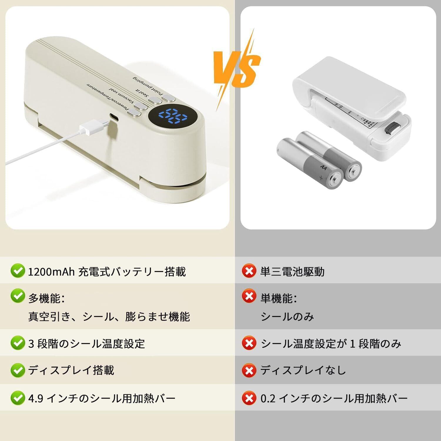 【パッケージ&一年間】1*真空パック機;5*専用袋;1*USB充電コード;1*エア注入針;1*エア注入ノズル;1*吸引ノズル。注:シールモード使用時は、高温部に触れないでください。注文してから1年間、もし品質やお使いに何かご質問がありましたら、どうか遠慮せずにこちらと連絡下さいませ。お問い合わせ方法ご案内します:「アカウントサービス」→「注文履歴」→「出品者に連絡する」。