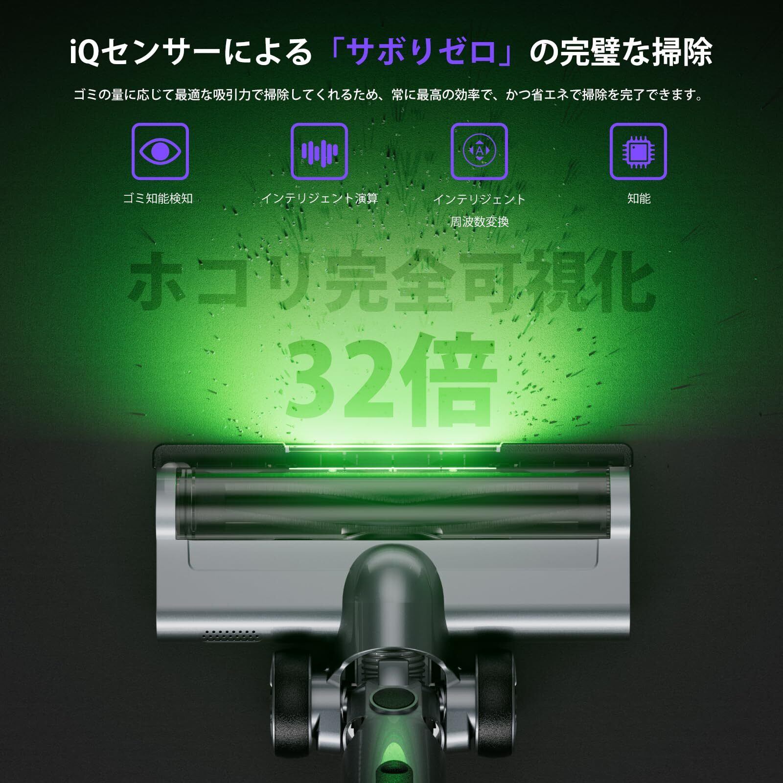 【革新版!「ごみくっきりライト」を搭載し見えないホコリを可視化!】掃除機は新たに全面発光緑色のLEDライトが備わっており、見えないホコリを可視化!従来の掃除機より可視率32倍アップ!市販の緑色ライトは片側に発光しかなくて照射範囲が狭い。掃除機 コードレスは全面発光で、光の分布がより均一で、暗いところはもちろん明るいところでも、見えにくかったゴミを浮かび上がらせて、微細なホコリや毛も可視化されて掃除効率を高めます。