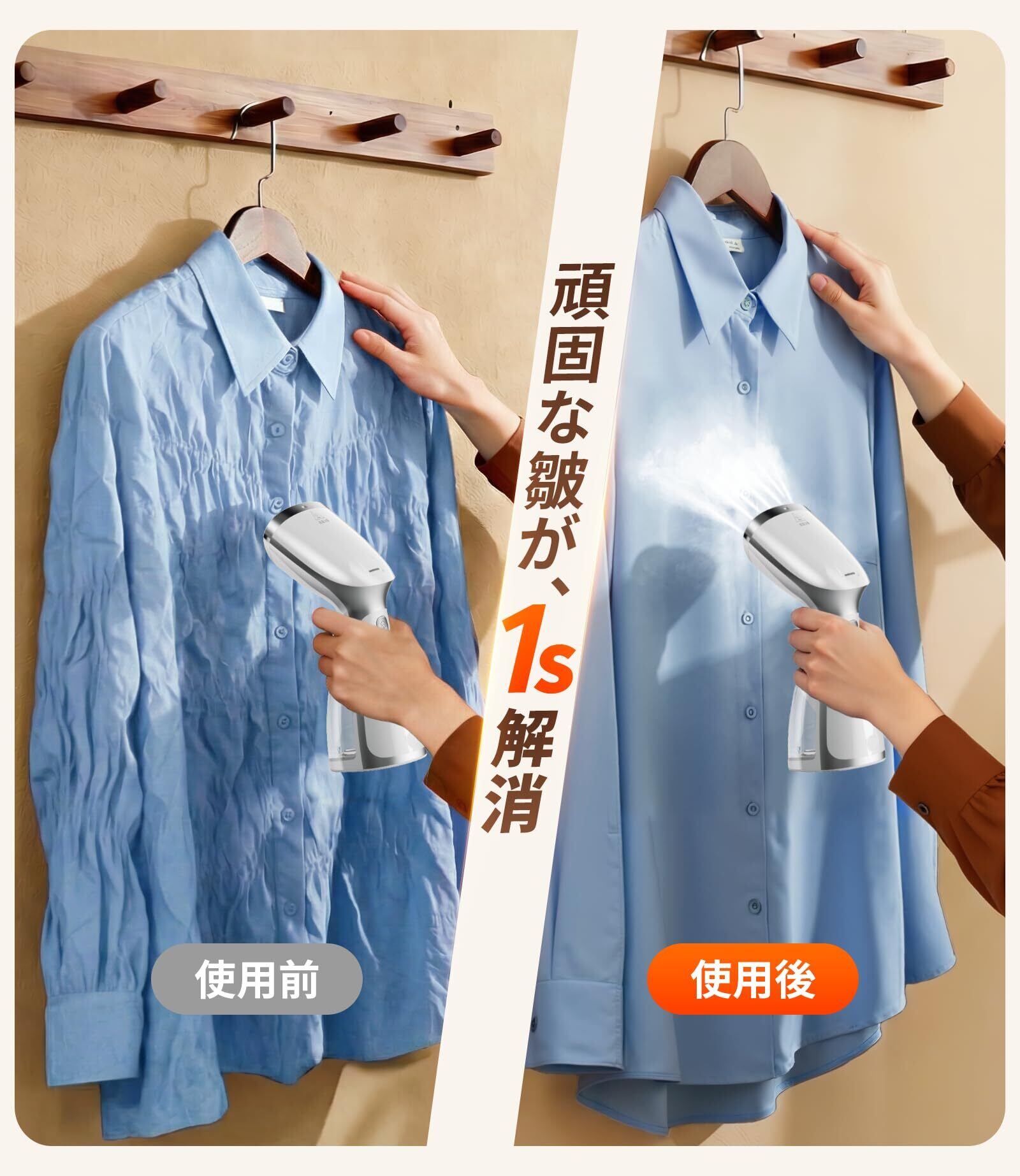 【1秒でシワ消去・3in 1スチームアイロン】強力なスチームが衣類の繊維奥まで瞬時に浸透。1秒でシワを伸ばしながら、型崩れを直してくれます。出勤前の忙しい朝でも、素早く仕上げられます。eueスチームアイロンは衣類スチーマーとして服をハンガーにかけたままシワ取りができて、アイロン台(スチームでプレス&ドライでプレス)を使用することも可能、一台三役を果たすスチームアイロンです。
