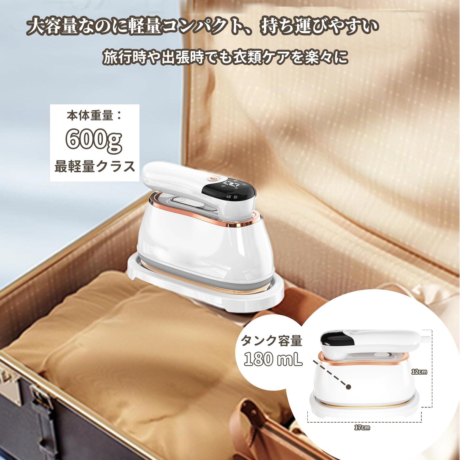 【折り畳み式・携帯アイロン】 本体重量わずか600gで女性でも楽々操作。180°折り畳みハンドルで手のひらサイズほどのコンパクトで、機内持ち込みも可能名サイズです。出張先での衣類ケアや旅先の急なシワ取りに重宝します。