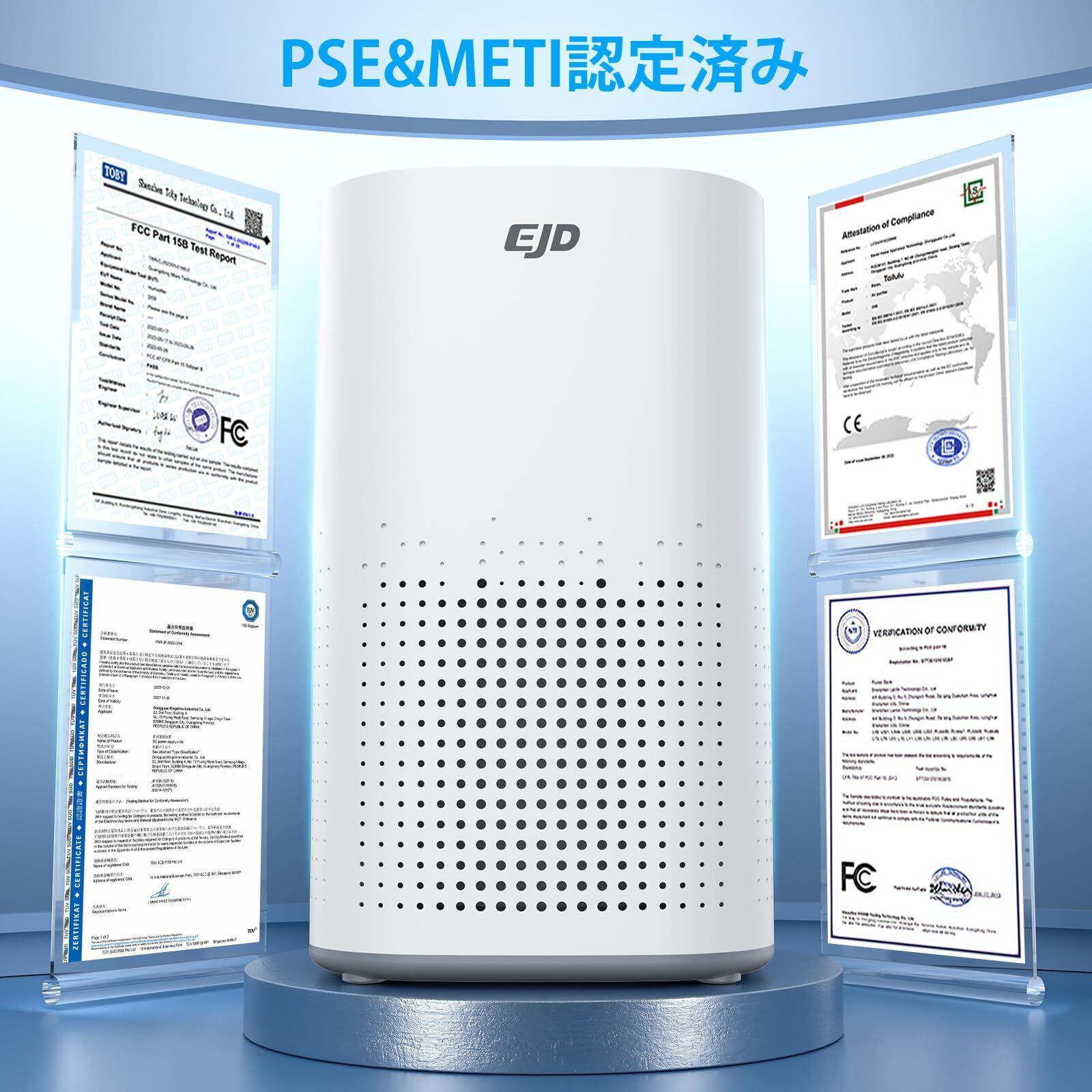 【革新版5層ろ過を実現!ニオイ対策・最強モデル新登場!】①空気清浄機 小型が業界初革新版H14 HEPAフィルターを採用し、集じん・除菌・脱臭・花粉対策の効果を著しくアップさせます。粒子イオン化技術と独自開発5層ろ過構造の組み合わせることで、CADR 250m³/hの高い浄化能力を誇り、圧倒的な清浄力をみせる!②極細の高密度プレフィルターでペットの毛やフケなどの大きな浮遊物をキャッチ効果2倍アップ!フィルターの寿命を向上。③特化型脱臭高吸着性活性炭フィルターは従来品より10倍の炭素量で消臭効果を60%高め、ペットの臭、料理臭、靴の臭、部屋干し衣類の生乾き臭など、日常生活に気になるニオイをしっかり取り除く。④新しい光触媒フィルターで消臭力が従来品より3倍早いスピードで異臭、有害ガスなどを分解でき!⑤ハイグレード抗菌フィルターで空気中の菌・浮遊ウイルスを不活性化し、除菌率99.99%!ご家族全員の健康を守ります。6畳-38畳対応の空気清浄機 小型の中に最強なモデルなので、ぜひEJD空気清浄機を試してみてください。