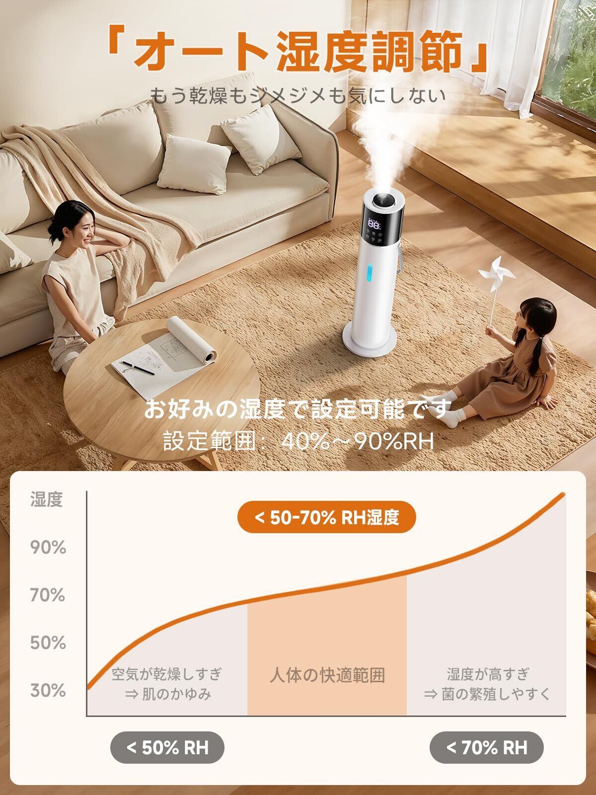 【スマート湿度調整・タイマー機能・リモコン操作】湿度は40%から90%の間で5%単位で設定可能。内蔵センサーが設定湿度を自動で維持します(設定湿度に達すると加湿器は自動停止し、湿度が低下すると再加湿を開始)。1時間単位で1~12時間まで設定可能なタイマー機能で、消し忘れの心配なく使用時間を自由にコントロール。タッチパネル式操作で各種機能を軽快に操作可能。温度・湿度・タイマー設定時間を画面にリアルタイム表示し、確認が容易です。付属のリモコンですべての機能を操作可能なので、離れた場所からでも便利にご利用いただけます。