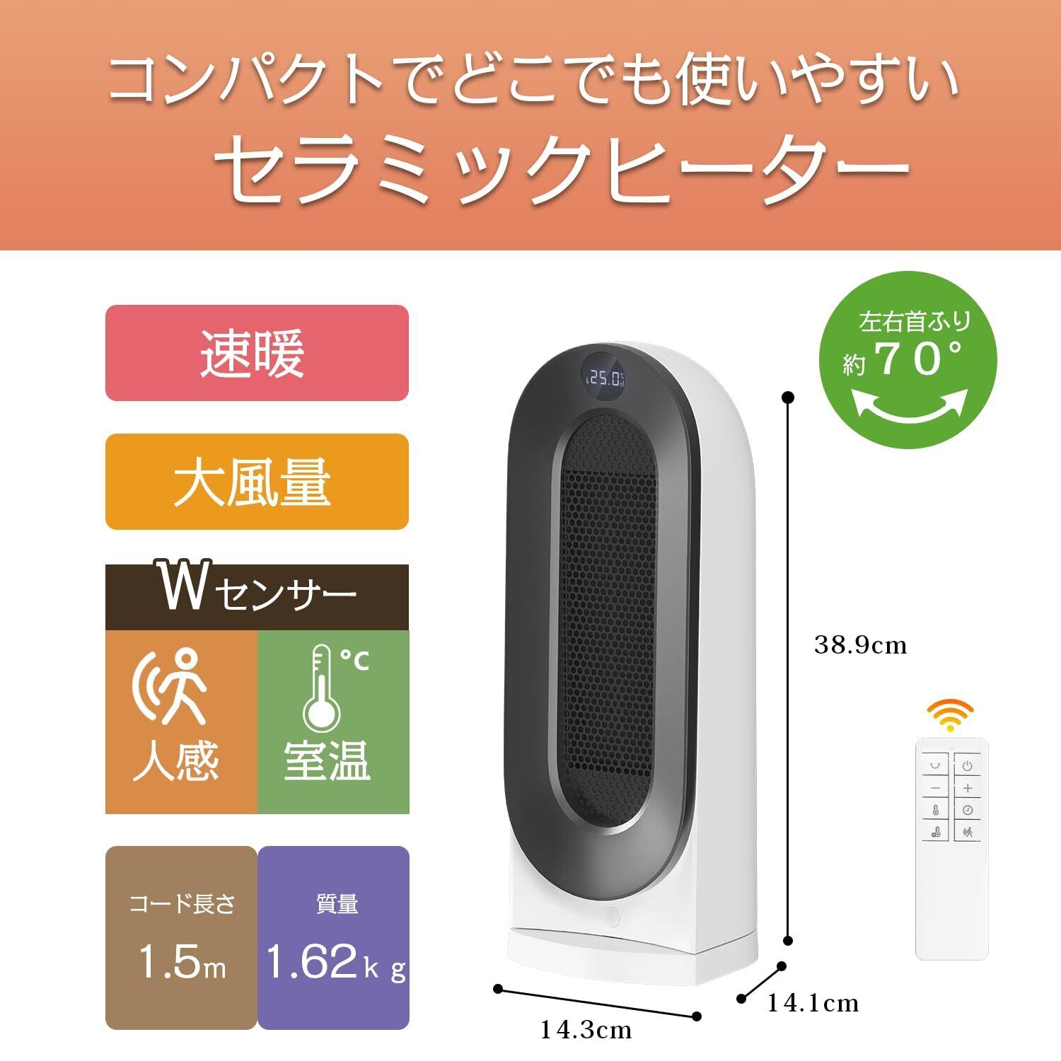特徴 15~35℃温度設定可能&切タイマー, 人感・室温Wセンサーで省エネ, 転倒時オフ&過熱防止&切り忘れ防止, 軽量&コンパクト・持ち運びやすい, 速暖・首振り・節電ECO運転
