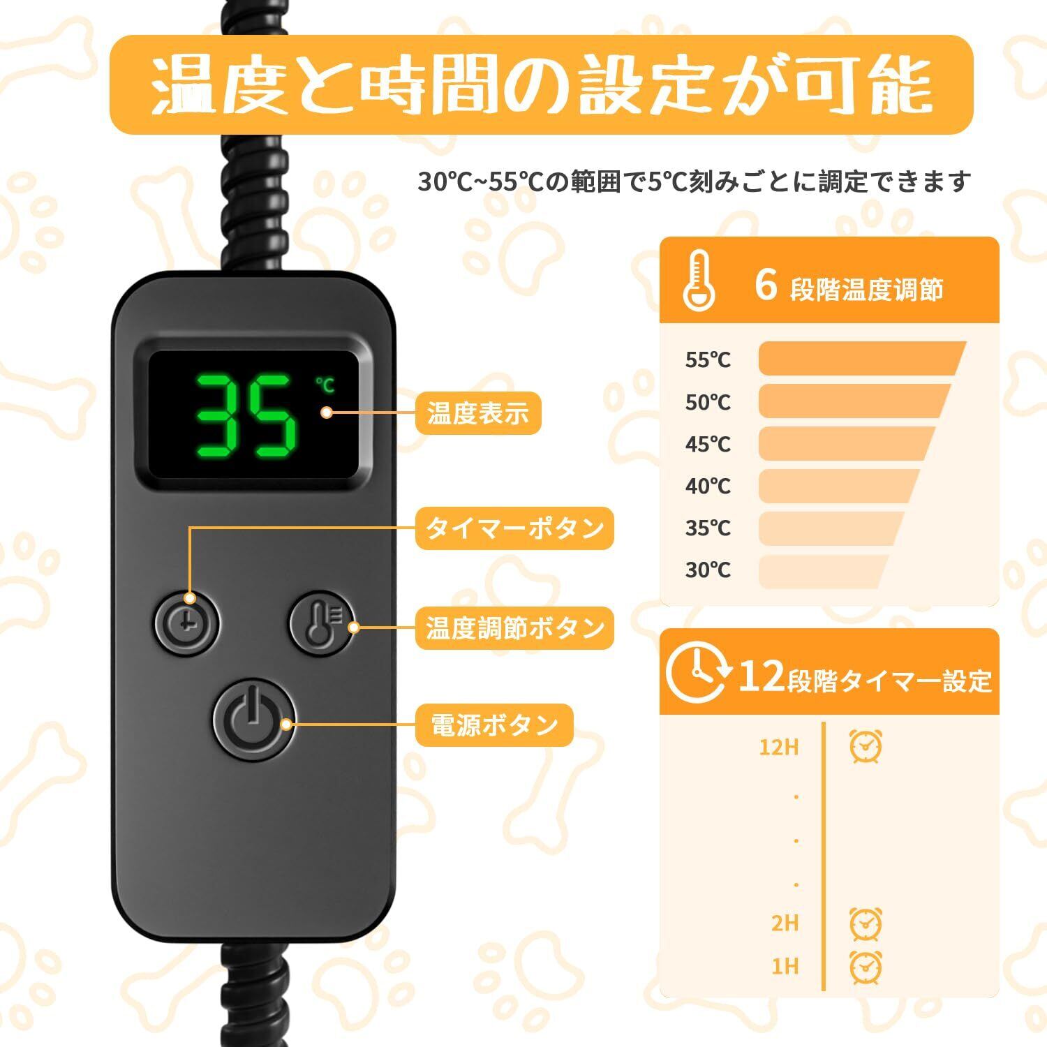 【60秒で速暖·6段温度調節 · 12段タイマー機能・省エネ】60秒で速暖なので、すぐ愛犬愛猫の寒さを解消し、室内の床からの冷気からペットを守ってくれます。ペット用ヒーターは気候やペットの状態に合わせて30℃~55℃までの温度が5°C刻みで調節可能です。ホットカーペットは、30°C、35°C、40°C、45°C、50°C、55°Cの6つの温度レベルで制御できます。温度は 5℃ 間隔で、対応してディスプレイに表示されます。このペットヒーターは1~12時間のタイマー機能があり、設定時間が過ぎると自動的にヒーターパッドがオフになるので、消し忘れの心配がありません!