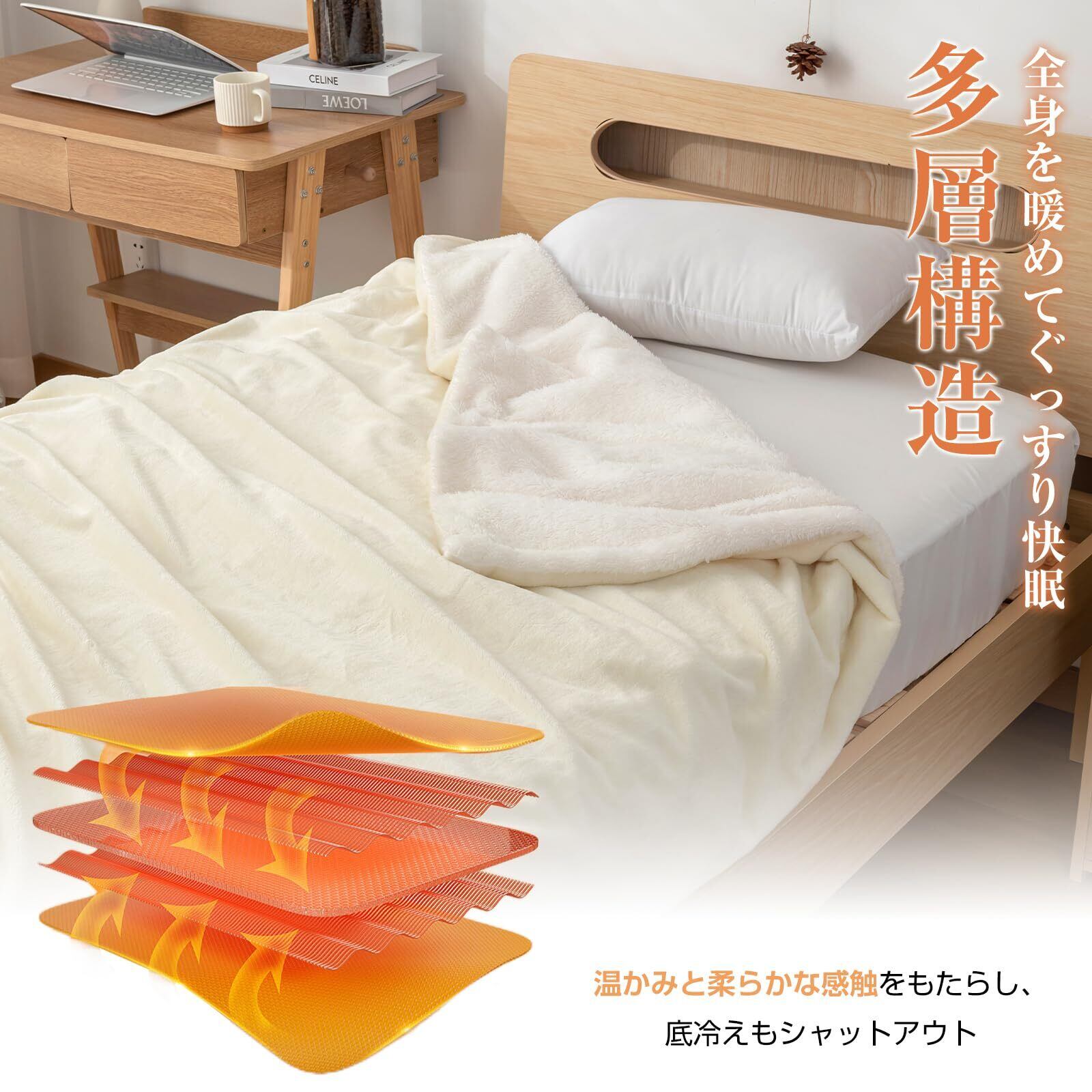 【3分で速暖】 この電気毛布の発熱速度が非常に速く、電源を入れてから30秒ほどで暖かさを感じ、約3分で素早く設定温度に到達します。布団や寝袋の中で使用すると、加熱効果がさらに高まります。冬で手足が冷えて寝つきが悪くなったり、寒い夜間で起きてしまったり、苦労している方にあったかぽかぽかの電気毛布をおオススメ。