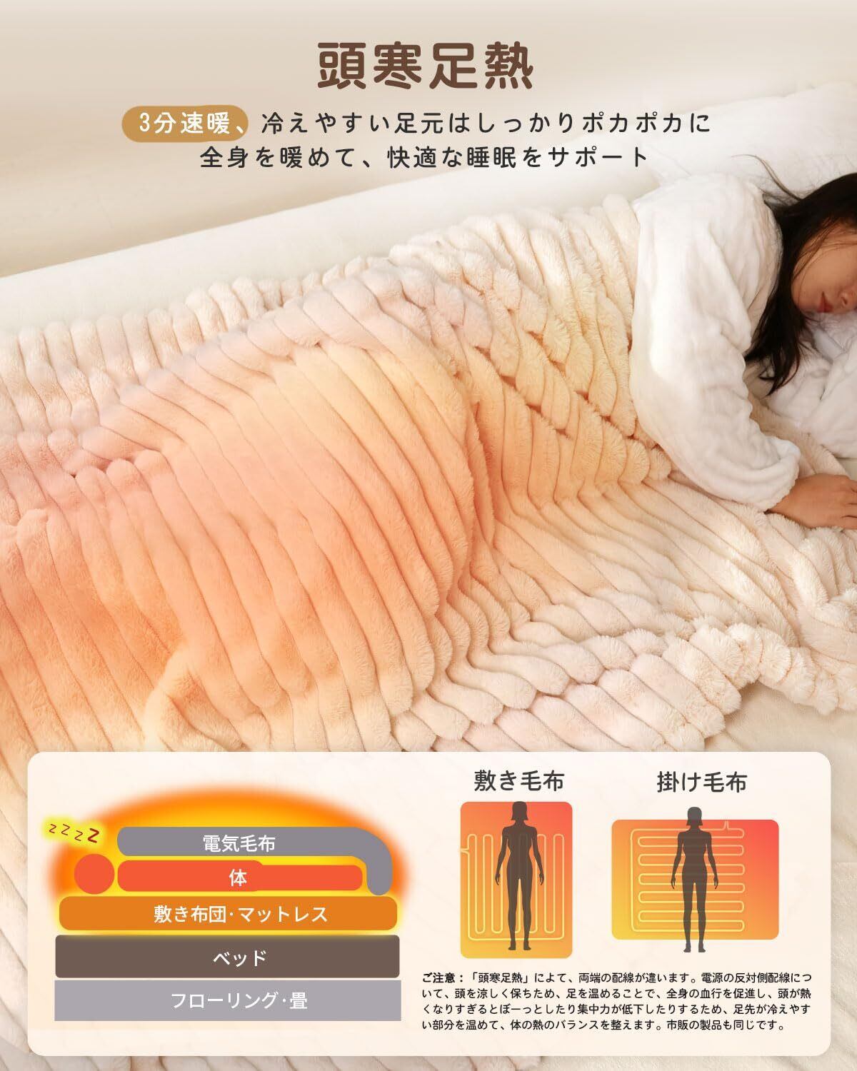 【頭寒足熱・恒温運転・省エネ】電気掛け毛布は足元からじんわりと体を温め、頭部との温度差を作る「頭寒足熱」効果で、深く快適な睡眠へと導きます。冷え性でお悩みの方や、質の高い睡眠を求めている方に最適。夜中に目が覚めることなく、朝までぐっすりお休みいただけます。また設定した温度で恒定に運転し、周囲の温度によって出力を調整でき、暖房費用を削減しながら暖かさを保ちます。更に電気敷き毛布の消費電力は僅か90Wで、ほかの暖房家電と比べて、電気代が安く、節電できる点が魅力です。財布に優しい暖房器具です!一度温まったら、ずっと心地よい温度を持続します。