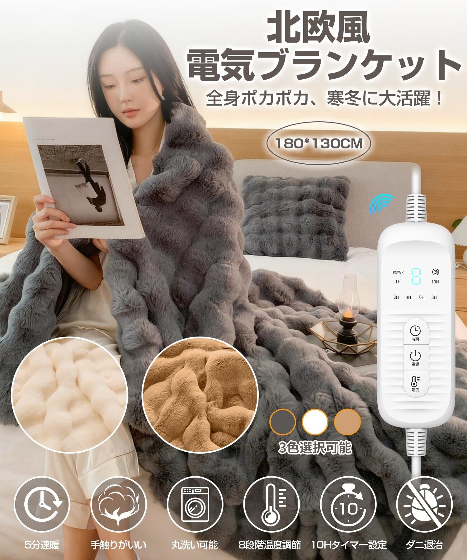 【2025年最新登場!180×130CM電気毛布 日本製】今年新発売の電熱ブランケットは、表面に最高級ラビットファーを採用。肌が触れる瞬間から「ふわっ」と包み込むような極軽やかな柔らかさと、もこっとした厚みのある温もりが同時に楽しめます。繊細で敏感な肌の方にも安心ななめらかな触り心地は、まるで子うさぎの毛並みのよう。肌に寄り添い、ストレスを与えない親肌設計で、就寝中でもリラックスしたまま快適な眠りをお約束します。この電気かけ毛布の裏面はコットンフランネル(綿100%)で吸湿・発散性に優れ、蒸れや不快な匂いの発生を抑えながら、ふんわりと体を温め続けます。電源に接続すれば毛布が素早く温まり、たちまち体中に温もりが広がります。さらにこの電気毛布は180×130CMの広々サイズだから、肩掛けやひざ掛けとしてもゆとりたっぷり!リビングで、オフィスで、あるいは就寝時にも、至福の温かさと極上の柔らかさをお楽しめください。