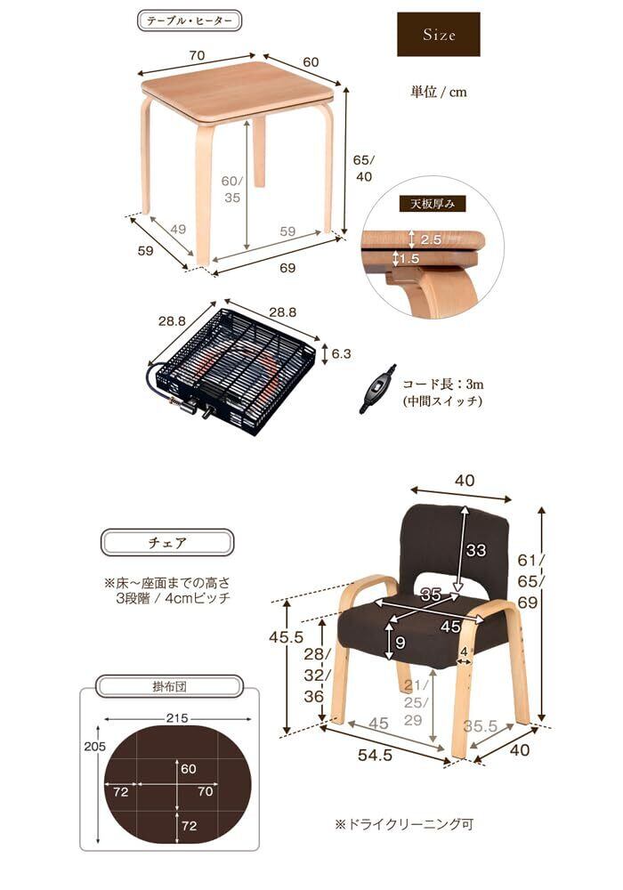 【備考】 ※2024年9月6日より チェアの温熱ガード追加、布団の仕様変更を行いました。 ※2025年10月16日より チェアがカバーリング仕様になりました。 【使用上のご注意】 ・乳幼児や身体の不自由な方、皮膚感覚が弱い方が使用する場合は常に使用温度にご注意下さい。また、低温やけどに繋がる恐れがありますので、一定時間ごとに身体を動かすなど注意して使用ください。・用途に応じた使い方をし、他に転用しないでください。・温度ヒューズは指定以外のものを使用しないでください。・電気毛布や電気敷布団等の採暖用器具と併用しないでください。 ・こたつを立てる、裏返しにする、脚を外す、衣服を入れての使用は絶対にお避け下さい。・定期的にヒーターやファンの周りについたホコリを掃除機などで取り除いて下さい。 ・使用しない時は必ずコンセントから電源プラグを抜いて下さい。