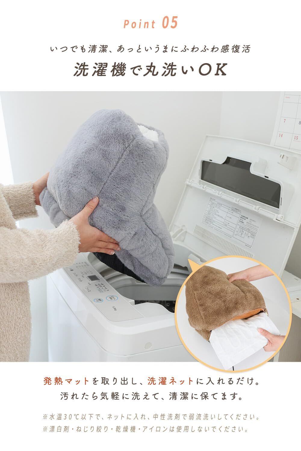 【丸洗いOKで清潔&幅広いシーンで活躍】 発熱マットを取り外せば洗濯機で丸洗いOK。毎日使っても清潔に保てます。リビングのくつろぎ時間、デスクワーク、勉強、就寝前のリラックスなど、寒い季節の“おうちの相棒”として大活躍します。足元があたたかいだけで冬の時間がぐっと快適に。