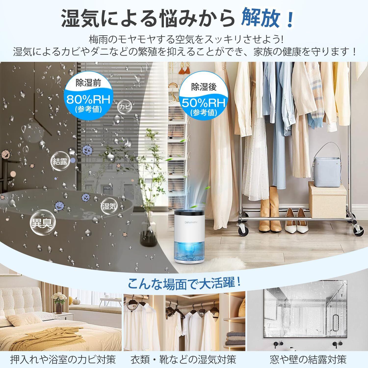 【狭所向け・コンパクト&軽量・持ち運び便利】本除湿機は狭い空間に向ける小型商品です。一人暮らしの男女はもちろん、子供の部屋などさほど広くない部屋に最適。除湿器には取っ手も付いているので持ち運びもラクラク。 僅か1.14kgの軽量設計、子供やお年寄りの人でも、片手で気軽に持ち運べる。(15*15*25cm)小型サイズで場所を取らないスリムタイプなので、除湿可能面積の目安:3-10畳(5-15平方メートル) 浴室、狭い寝室、狭い台所、クーロゼット、キャラバン、地下室、ガレージ、下駄箱などの狭い場所に対応できます。寝室/台所/風呂場/脱衣所/洗面所/トイレ/押し入れ/書棚/玄関など狭い仕切られた空間で使うのに便利。