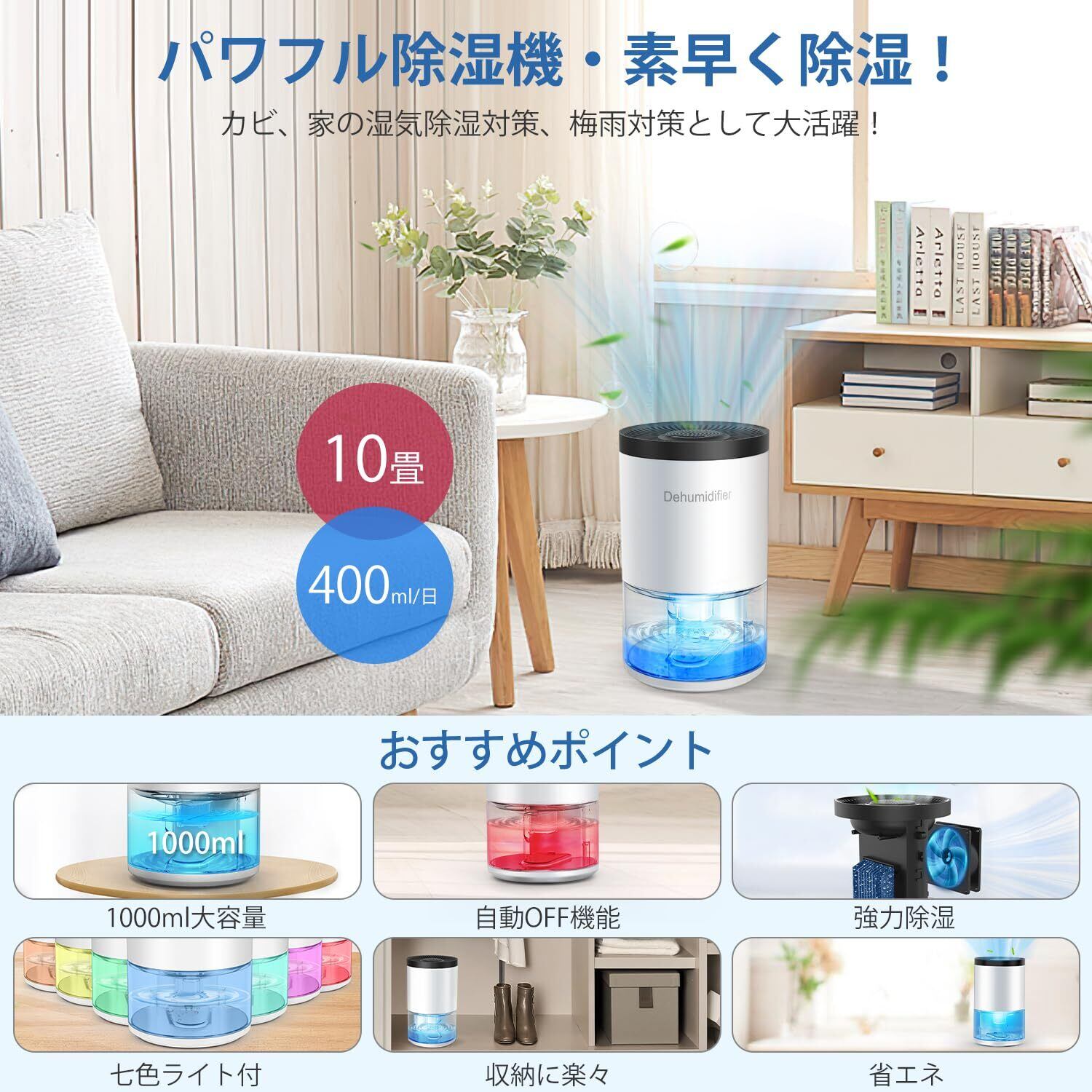 除湿機 除湿器 小型 強力除湿 大容量1000ML 湿気取り ペルチェ式 じょしつき コンパクト 狭所に向け 7色ライト付き ワンタッチ操作 静音運転 省エネ 消臭 湿気&梅雨対策 結露防止 カビ防止 部屋干し 満水自動停止機能 スピード乾燥 軽量 持運び便利 卓上/クローゼット/洗面台/リビング/寝室/オフィス 除湿 日本語説明書付 (ホワイト)