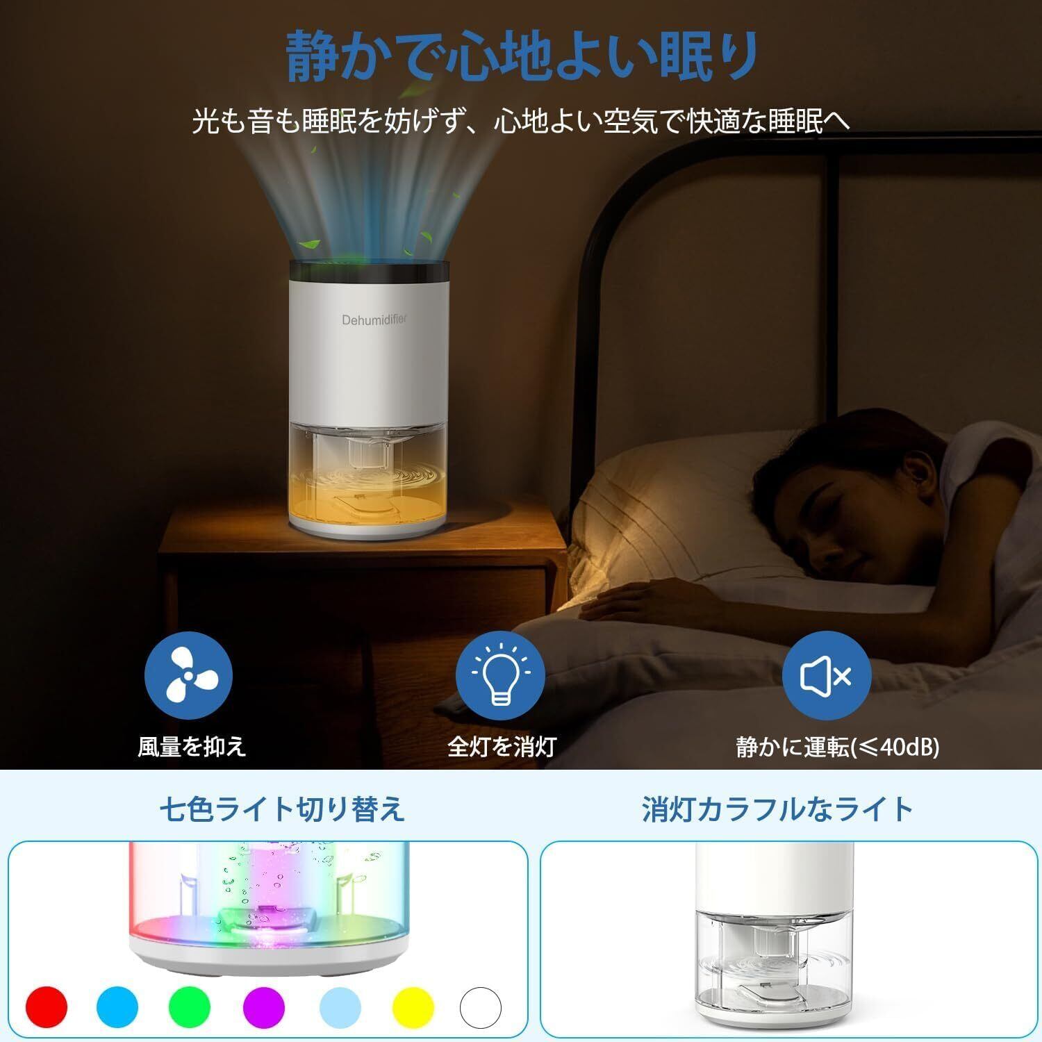 特徴 ワンタッチで操作簡単, 七色ナイトライト, 強力除湿, 省エネ, 自動シャットオフ