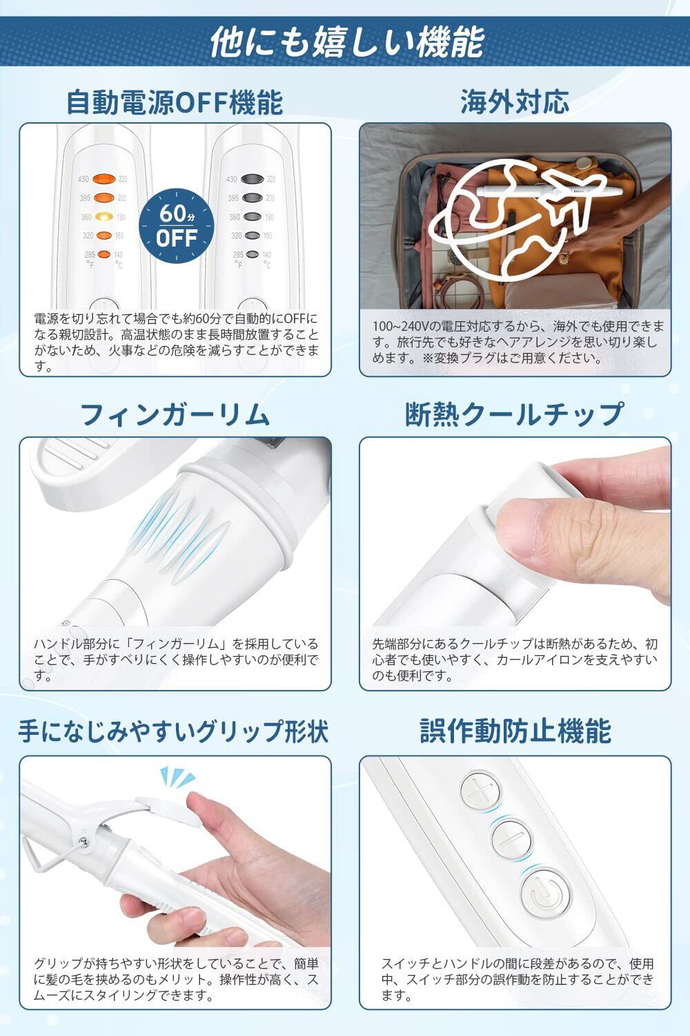 【他にも嬉しい機能】❶使用中もつれや絡まりにくい360度回転コードを採用します。❷自動電源OFF機能搭載で、電源を切り忘れて場合でも約60分で自動的にOFFになる。❸170mmロングバレルは、ロングの人や毛量が多い人も巻きやすい。