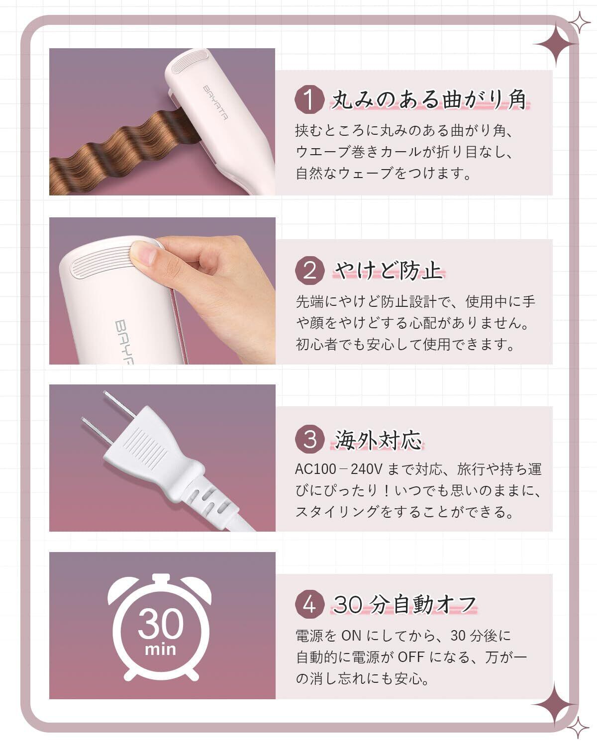 【30分自動オフ&やけど防止&海外対応】安全的にご使用いただけるようにヘアアイロンが30分後電源オフ機能を搭載します。電源を切れることを忘れても自動的にオフできます。やけど防止ためワッフルアイロン先端にやけど防止部を設計します、髪を挟む時手や顔をやけどする心配がありません。初心者でも安心して使用できます。ヘアアイロンがPSE認証済でご安心的に使用いただけます。AC100-240Vまで対応、海外対応、変圧器は不要、旅行や持ち運びにぴったり!いつでも思いのままに、スタイリングをすることができる。