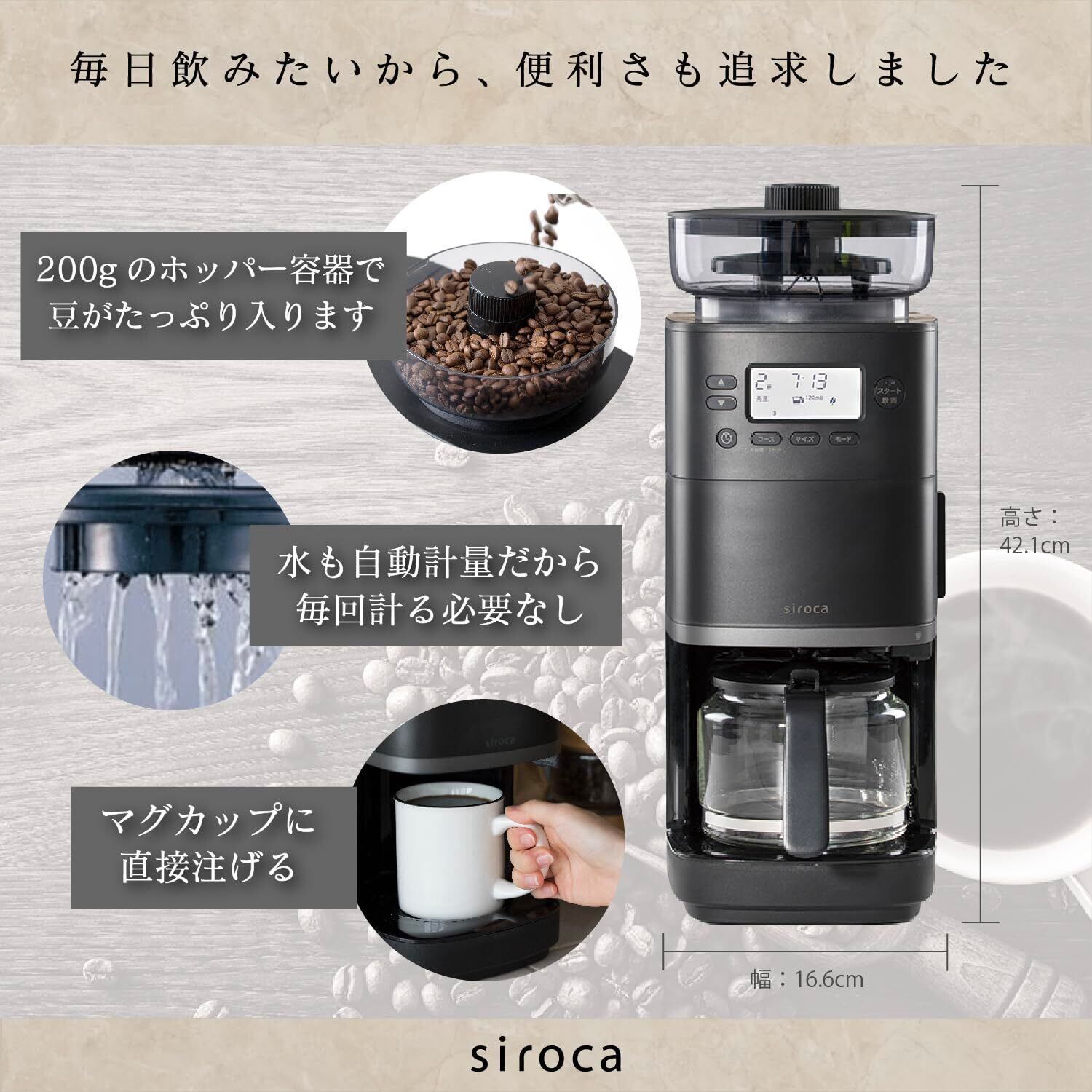 シロカ コーン式全自動コーヒーメーカー カフェばこPRO CM-6C261(K) ブラック|ガラスサーバー 豆・粉対応 豆・水計量不要 ミル機能 挽き目無段階調節可能 最大6杯 タイマー予約機能 マグカップ直接抽出 ステンレスフィルター付き