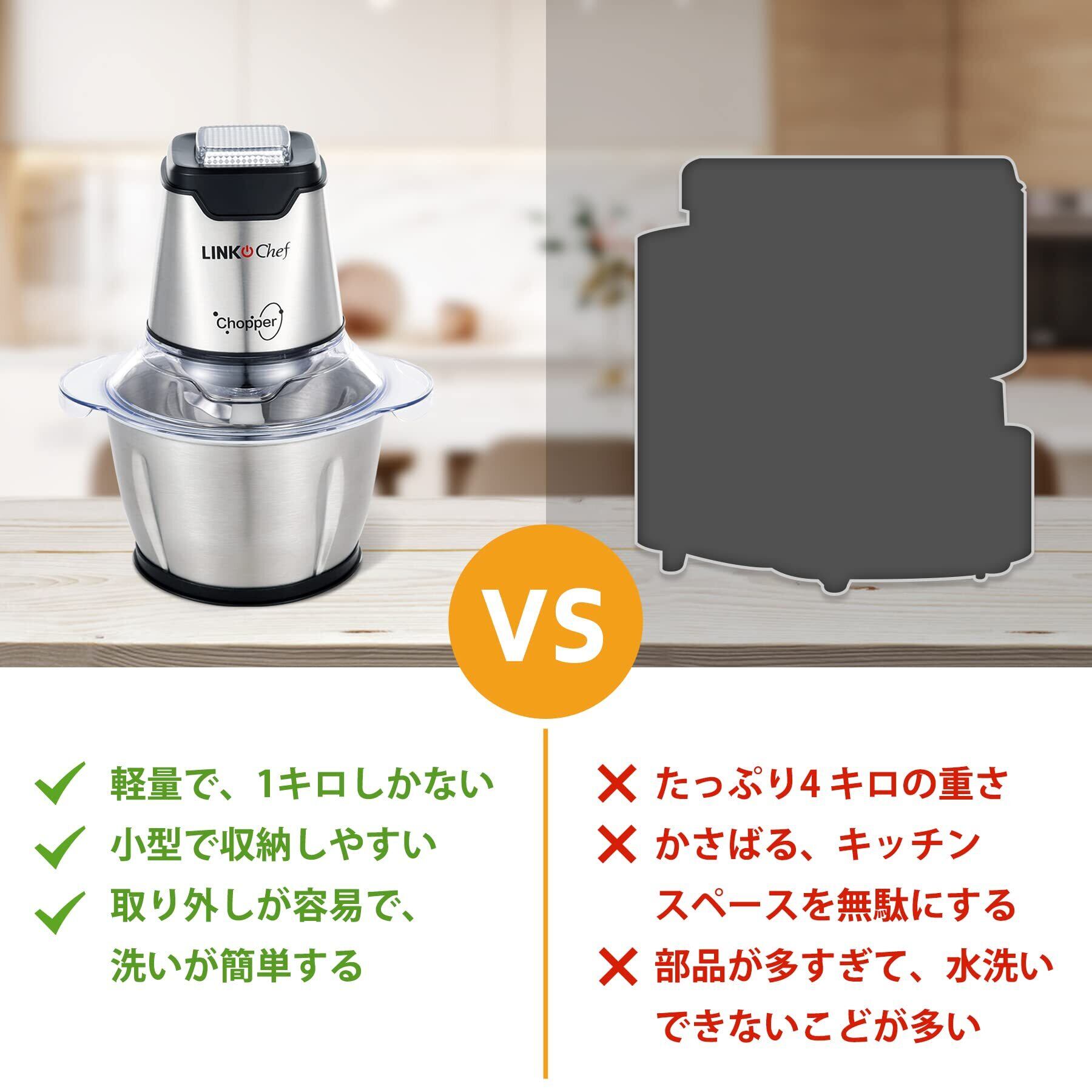 【高級な外観デザイン・過熱保護装置搭載】大きな押しボタンは特別なダイヤモンドスタイルで、高級感に溢れ、プレゼントとしても最適です。台座は滑り止め設計で、安定性・安全性が高いです。コンパクトで収納に便利!※当社のフードプロセッサーには過熱保護機能が搭載されており、本体の温度が高すぎると、電源が自動的に切断されます。20〜30分経過後、再度使用可能です。底部のシリカゲルは滑り止めで、プロセッサーの運転をより安定させます。静かで安全にご利用いただけます。