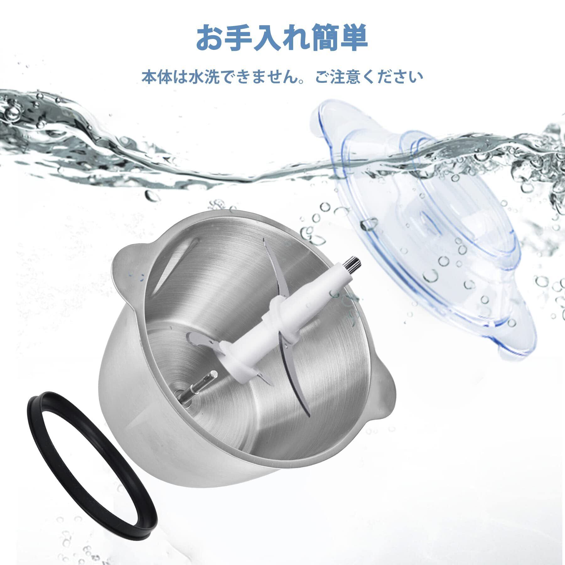 【簡単お手入れ、便利なフードプロセッサー】食器を洗うような感覚で、油汚れも簡単に洗い流せるので、お手入れがとても簡単です。みじん切り後も、包丁やまな板を使わずにカップ内で全て完結するため、後片付けがとても楽になります。さらに、強力なモーターと多機能な刃を搭載しており、料理の幅を広げることができます。パッケージ内容:本体(モーター部分)×1、フードプロセッサー×1、日本語取扱説明書×1。お気軽にご質問やご要望がございましたら、いつでもお問い合わせください。