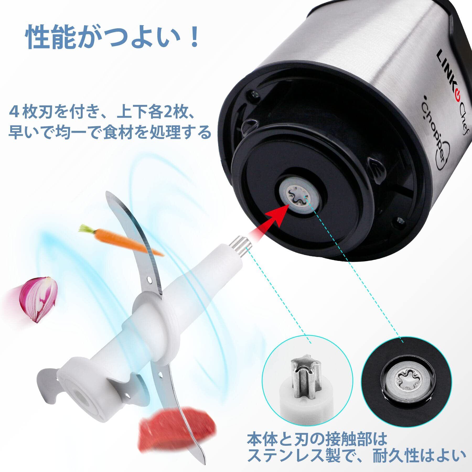 【みじん切りが秒で完了】このフードプロセッサーは250Wの純銅モーターを搭載し、安定かつ抜群な動作を確保しています。また、上下に2枚ずつ計4枚の鋭いカッターが付いています。上下のカッターでカットしながら混ぜることができるため、野菜やお肉などを素早く刻み、ペースト状に仕上げることができます。忙しい朝の時短料理や、手間のかかる下ごしらえなど、さまざまなシーンで大活躍します!