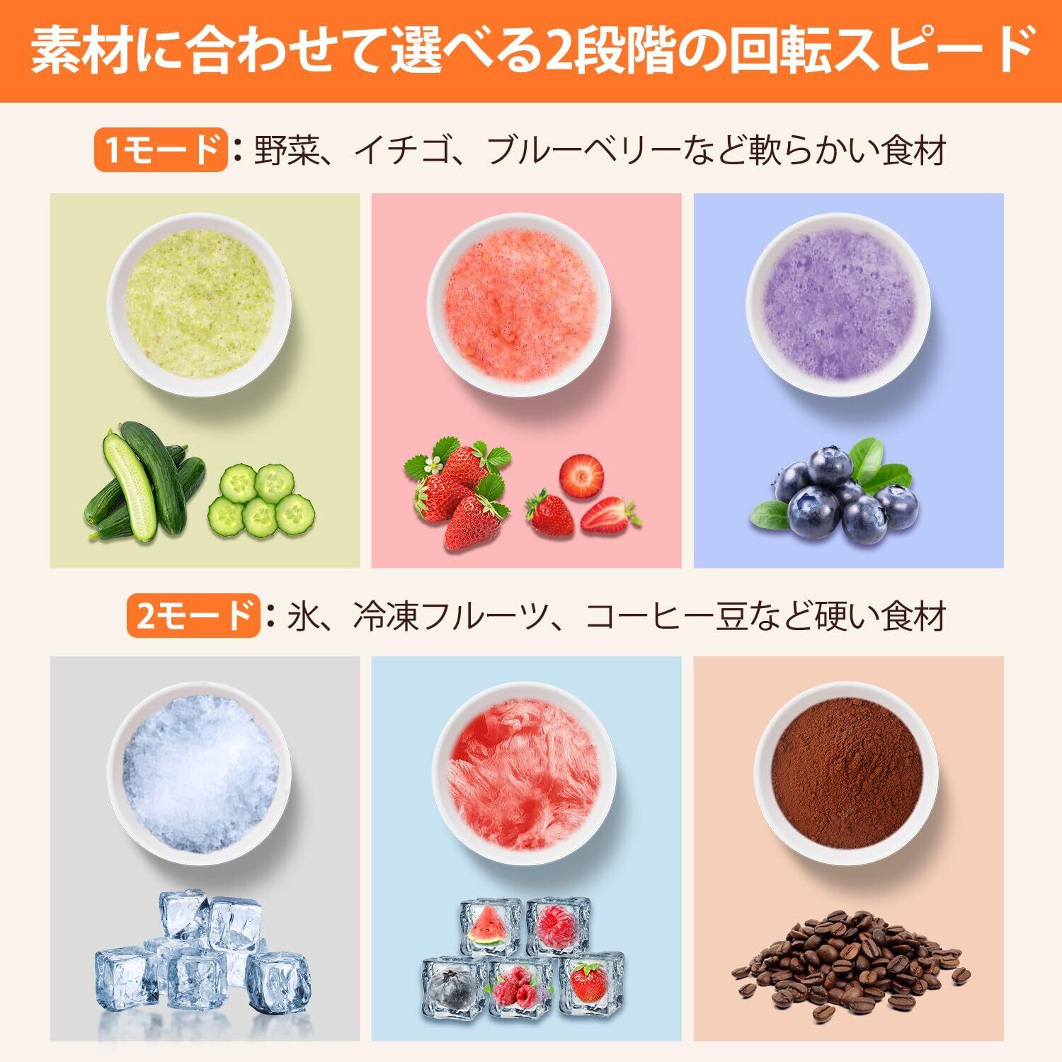 「3段階モード&使いやすい&お手入れ簡単」 ボタンを回すだけで、初めてでも簡単に操作できます。ケガをする恐れもございません。撹拌に便利なフラッシュ機能搭載。 低速・高速運転の2段階スピードで、食材の硬さに合わせて使い分けができます。ミキサーについてお手入れでお困りの方が多かったので、本製品は取り外して細部まで水洗い可能です。カッターの刃と台座が外せるため、細かい汚れもしっかり落とせます。細かく分解できるので簡単かつ衛生的です。忙しい毎日でも、スムージー生活がおいしく続けられます。